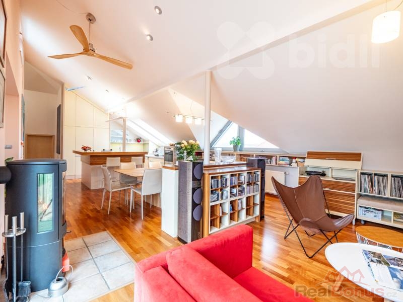 Byt se nachází ve 3. patře a nabízí prostorné uspořádání, které splňuje vysoké nároky na příjemné bydlení. Architektonický návrh od renomovaných tvůrců Patrika Kotase a Hynka Maňáka proměnil původní půdu, rozprostírající se přes čtyři bytové jednotky, v jedinečný a vzdušný prostor.