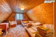 Chata má příjemnou dispozici, která dává smysl. V přízemí najdete prostorný obývák s velkým stolem, s krbovými kamny, které vyhřejí prostor dřív, než si připijete s hosty na přivítanou. Dále tu je kuchyňský kout, koupelna se sprchovým koutem a WC. Z obýváku vyjdete na balkón kde můžete obědvat na čerstvém vzduchu. V podkroví jsou dvě ložnice s celkem 8 postelmi. Ve zděném suterénu máte tři místnosti a přímý výstup na zastřešenou terasu. Schodiště je šikovně umístěno uvnitř a odděleno od obytného prostoru. Zavolejte mi a na prohlídce vám ukážu, jak prakticky je to všechno vyřešené.