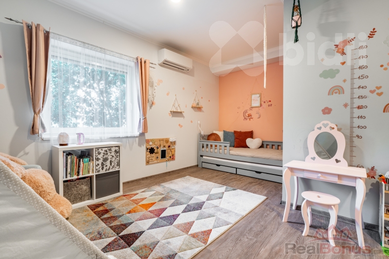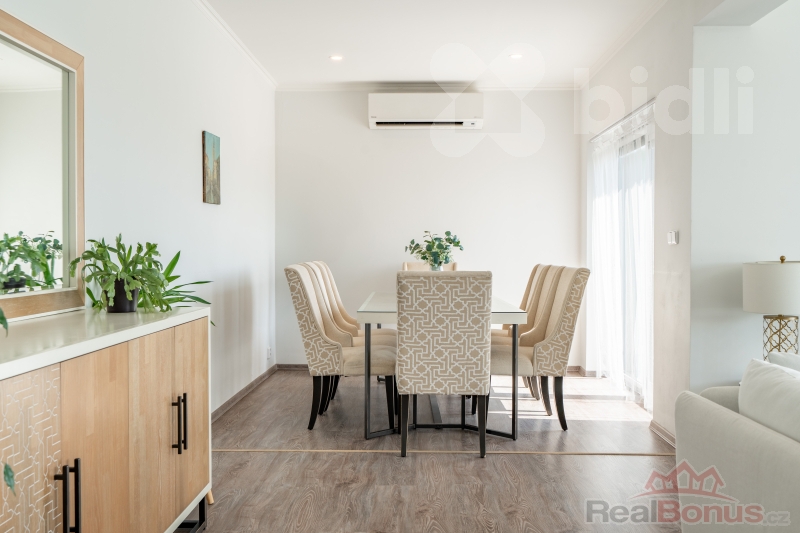 V přízemí vás zaujme dominantní obývací prostor s kuchyní a přímým vstupem na terasu a do zahrady - ideální místo pro letní večery, rodinné oslavy nebo klidné posezení. Patro naopak poskytuje absolutní soukromí - prostorná ložnice se šatnou, samostatná koupelna a velký pokoj, který může sloužit jako relaxační zóna, herna či domácí kino.