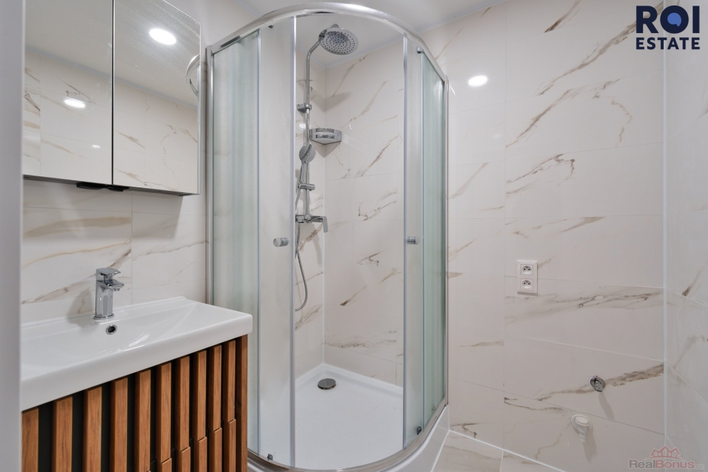 Koupelna se sprchovým koutem, samostatné WC.