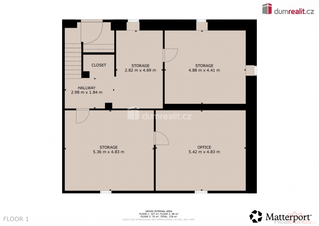 V 1. patře domu se nachází velký obytný prostor s kuchyňským koutem, který navazuje na jeden z menších pokojů. Druhý menší pokoj je přístupný samostatně z chodby. Patro doplňuje koupelna.