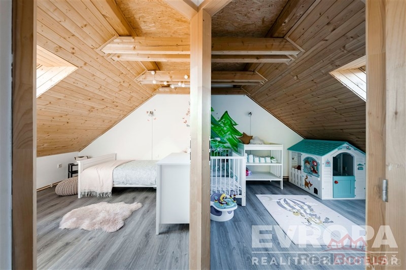 Interiér je dokonalým propojením dřeva, doplněné o designovou dlažbu, luxusní spotřebiče a hlavně je zde na každém kroku cítit otisk vkusného a praktického využití každého koutu.