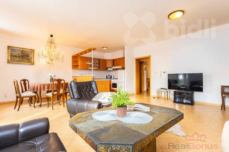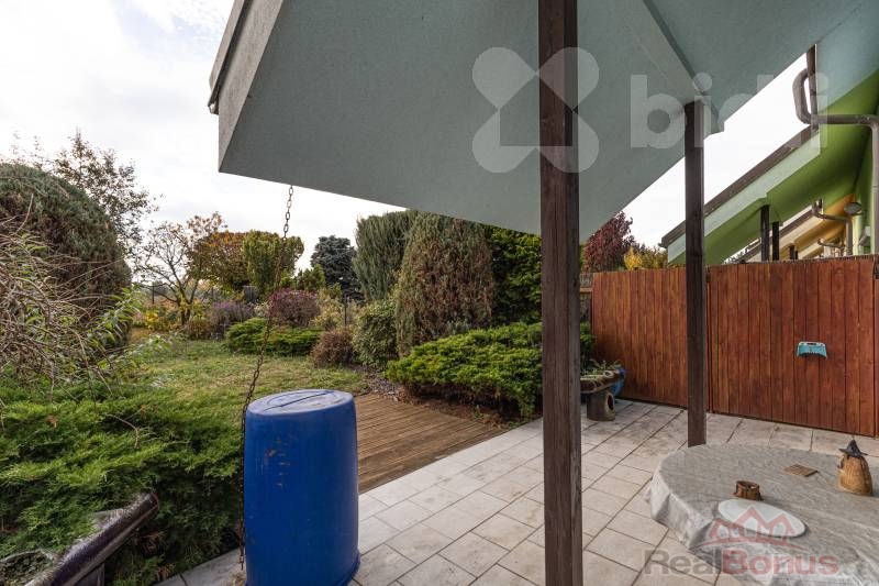 V přízemí domu je vstupní chodba, samostatná toaleta a prostorný obývací pokoj propojený s kuchyňskou částí, vybavenou kuchyňskou linkou. Z obývacího pokoje je přímý vstup na terasu a do udržované zahrady o velikosti 148 m2 s okrasnými keři.