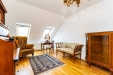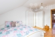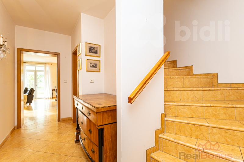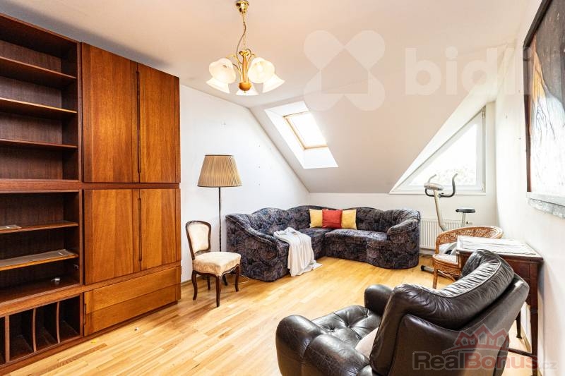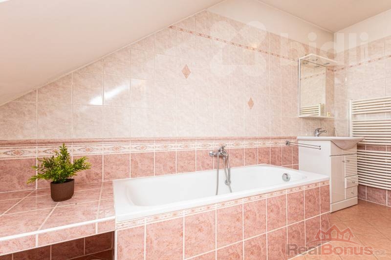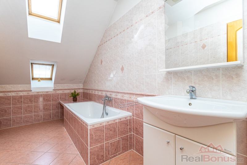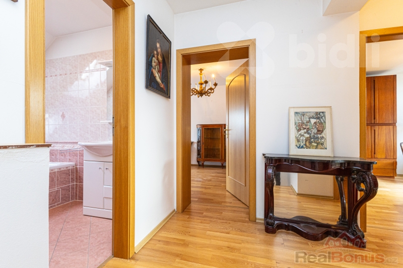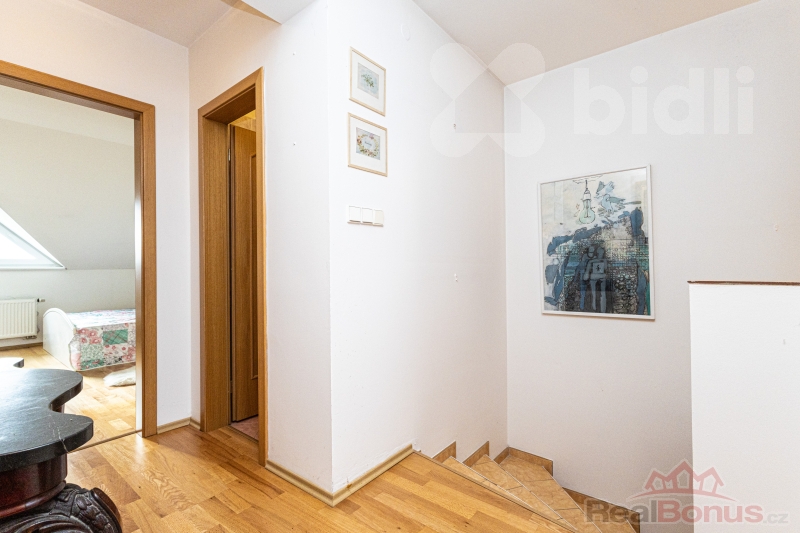 Po prostorném schodišti se dostaneme do patra, kde jsou ložnice, dětský pokoj, samostatný pokoj, koupelna s vanou a oddělené WC. V přední části domu vedle vchodu je garáž a další místo pro parkování je na dlážděném a oploceném pozemku před domem.