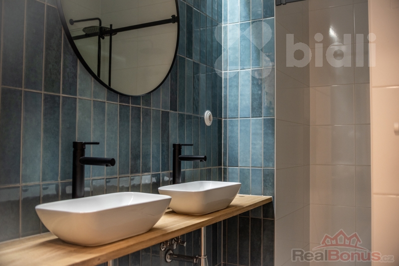 Koupelna potěší moderním designem - jsou zde dvě umyvadla a prostorný sprchový kout navržený pro dvě osoby, doplněný velkým zrcadlem a WC.