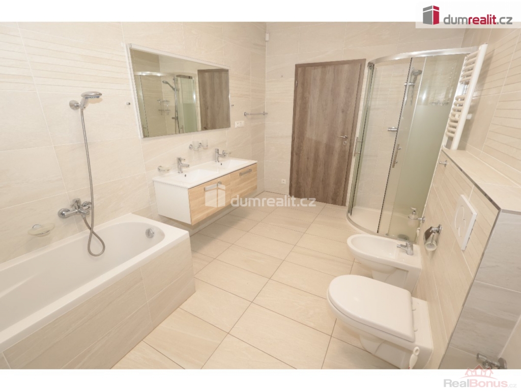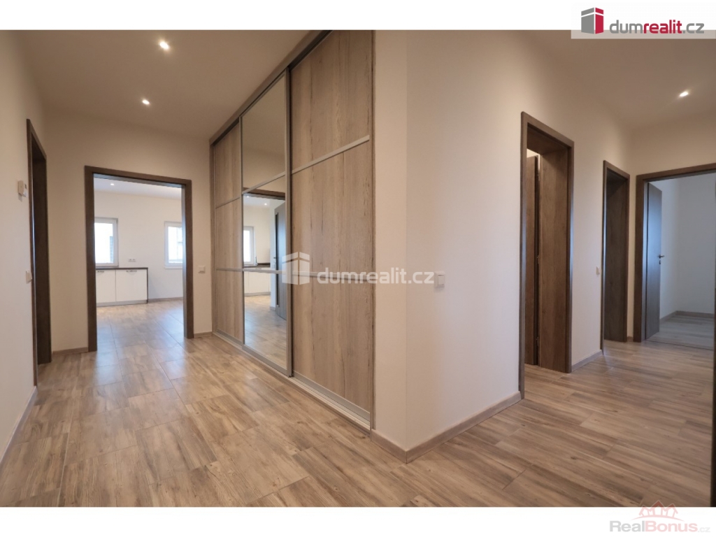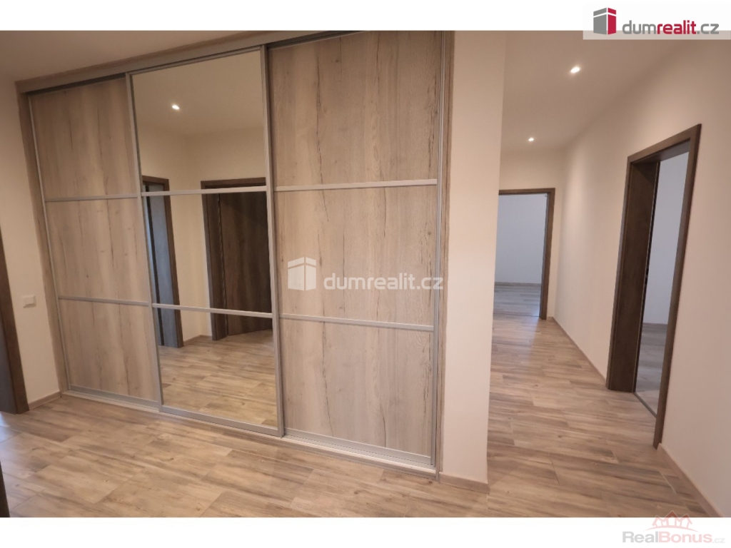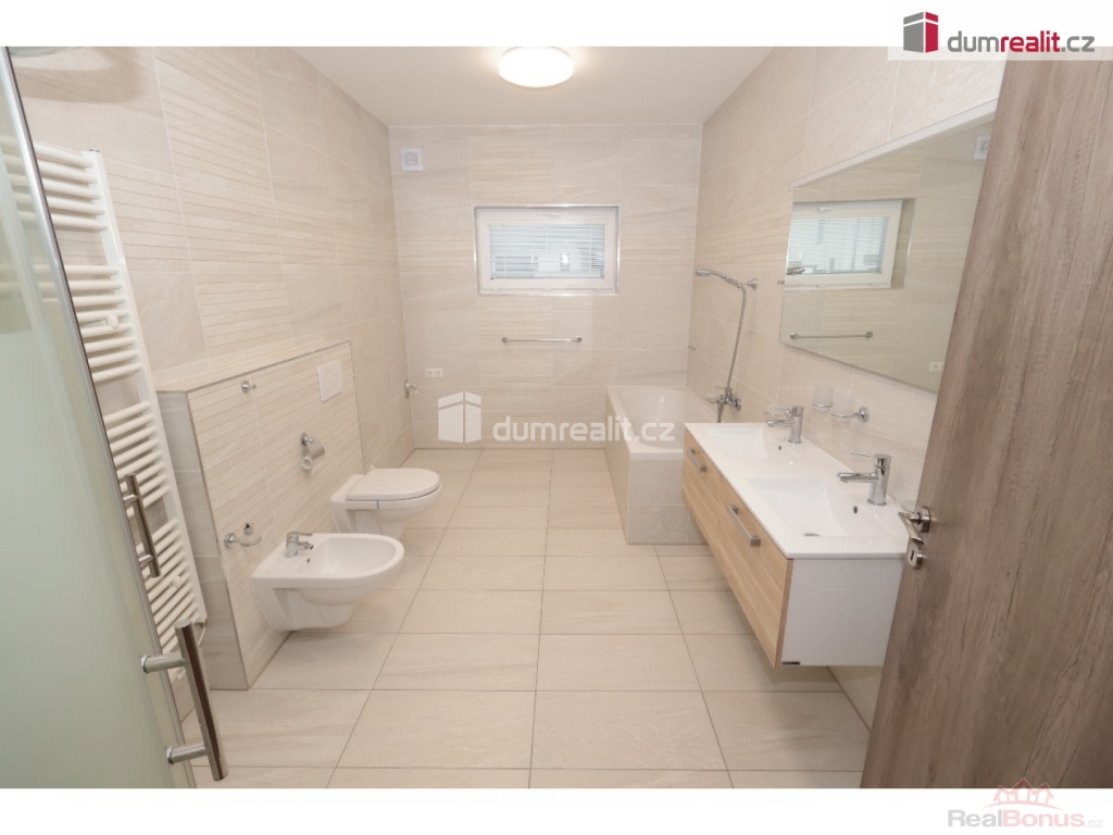 záloha na vodu 1500 Kč, elektroměr a plynoměr se hlásí na nájemce, Dumrealit.cz Vám zprostředkuje exkluzivně pronájem nízkoenergetické, bezbariérové novostavby domu (2018 top stav) s dispozicí 4+kk, 152,40 m + 8 m krytá terasa, v obci Sibřina, nedaleko městyse Říčany, 3 km od Prahy. Dům je volný od listipadu, prohlídky jsou již monžné, aktuálně se maluje a připravuje pro nového nájemce. Plocha pozemku je 1143 m, zastavěná plocha je 200 m, zahrada má 943 m. Dispozici domu 4+kk (152,40 m) s garáží (20 m) tvoří prostorný obývací pokoj (40,9 m) s možností instalace krbových kamen, prakticky spojený s kuchyňským koutem, který je vybavený luxusní zakázkovou kuchyňskou linkou se spotřebiči (myčka 60, indukční deska, digestoř a vestavěná el. trouba a vestavěná mikrovlnka). Kuchyňský kout má praktickou komoru/špajz (1,93 m). Z obývacího pokoje je vstup přes francouzské dveře na zastřešenou terasu (8 m) a na zahradu (943 m). Další místnost domu 4+kk (152,4 m) tvoří: ložnice (15,76 m), dětský pokoj (14,48 m) a pokoj (13,88 m), centrální koupelna (9,84 m) s vanou, umyvadlem, toaletou, bidetem, sprchovým koutem a oknem. Dále jsou v domě: komora / technická místnost (4,43 m), toaleta (2,40 m), velká interiérová chodba (14,12 m), zádveří (6,46 m), samostatný sklad (8,20 m), který má přístup ze zahrady a je zde umístěn plynový kotel, a velká garáž pro 1 auto (20 m) se vstupem do domu. V celém domě je podlahové/teplovodní vytápění pomocí plynového kotle a klimatizace. Konstrukce domu je z materiálu Ytong. Na podlaze ve 2/3 domu je praktická dlažba, ostatní pak plovoucí podlahy. Vjezd do garáže je ovládán elektronicky. Tento dům je volný od listopadu, je v osobním vlastnictví, elektroměr a plynoměr se hlásí na nájemce. Zvíře se řeší individuálně. Na zahradě je 4 m3 nádoba na dešťovou vodu zalévání. Internet pomocí místní WIFI, dům má vlastní alarm. Majitel garantuje stabilní dlouhodobý pronájem, aktuální nájemce se stěhuje na vlastní žádost po 3 letech. Dům pronajímáme od roku 2018. Velmi doporučuji všem, kteří hledají bungalov s velkou zahradou a garáží. Ev. číslo: 652493. Energetický štítek: B (167 kWh/m2/rok).