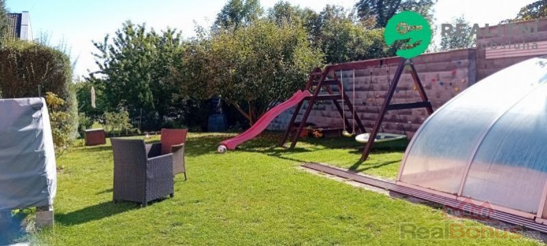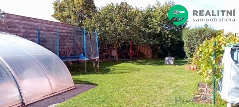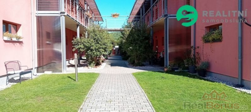 Byt je součástí dvou domků, které vytvářejí útulný dvorek. Cestička lemovaná okrasnými keři vás zavede k blankytnému bazénu. Vedle něj najdete houpačky, klouzačku, pískoviště, trampolínu i pergolu se zahradním posezením, grilem a lednicí  ideální místo pro sousedská setkání.
