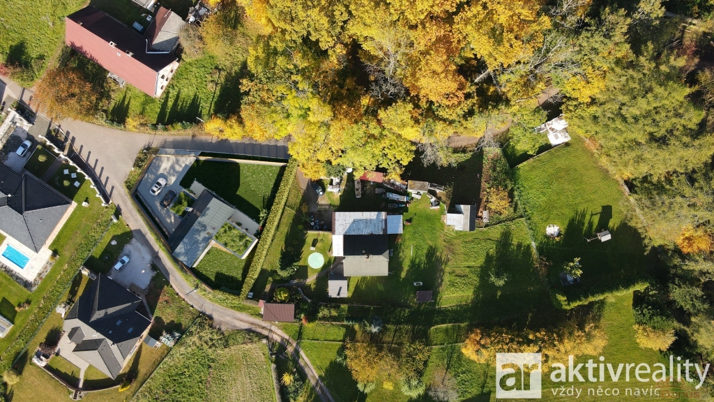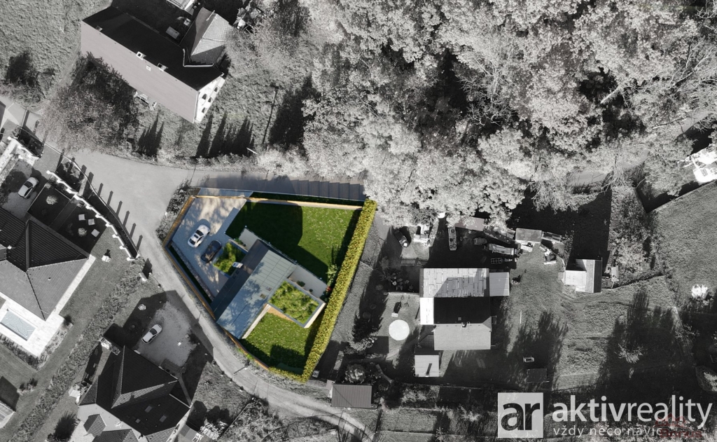 Terén je mírně svažitý a pozemek je situován níže pod úrovní okolní zástavby, což přináší pocit klidu a soukromí.