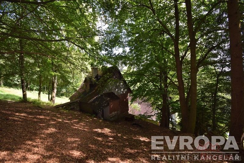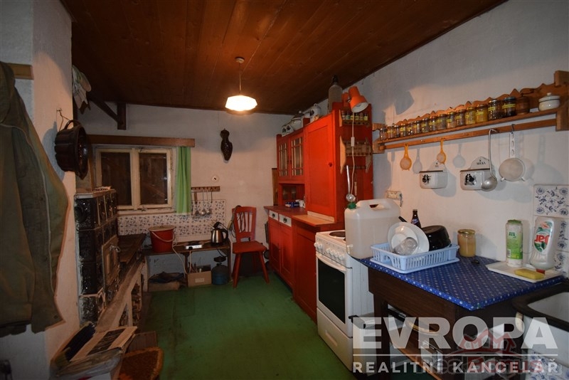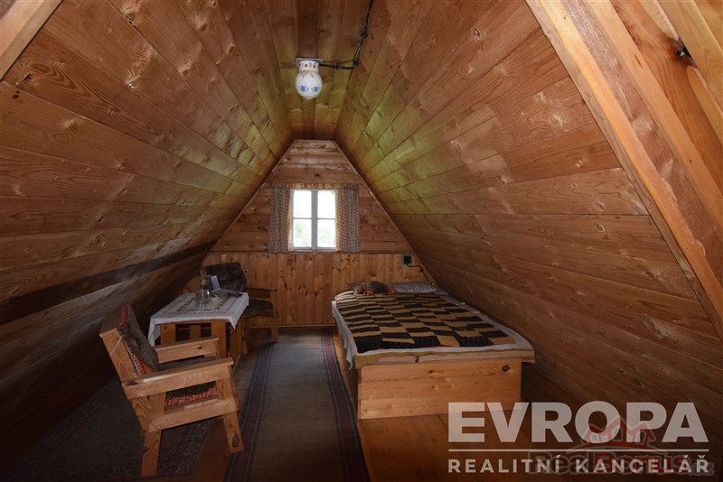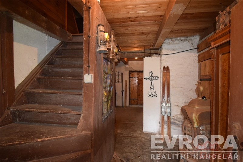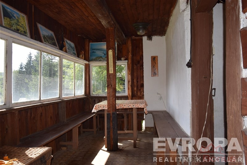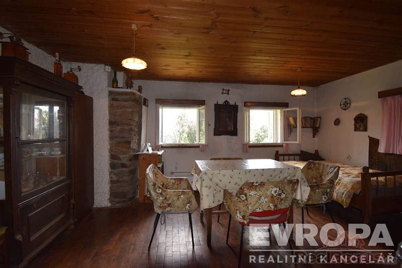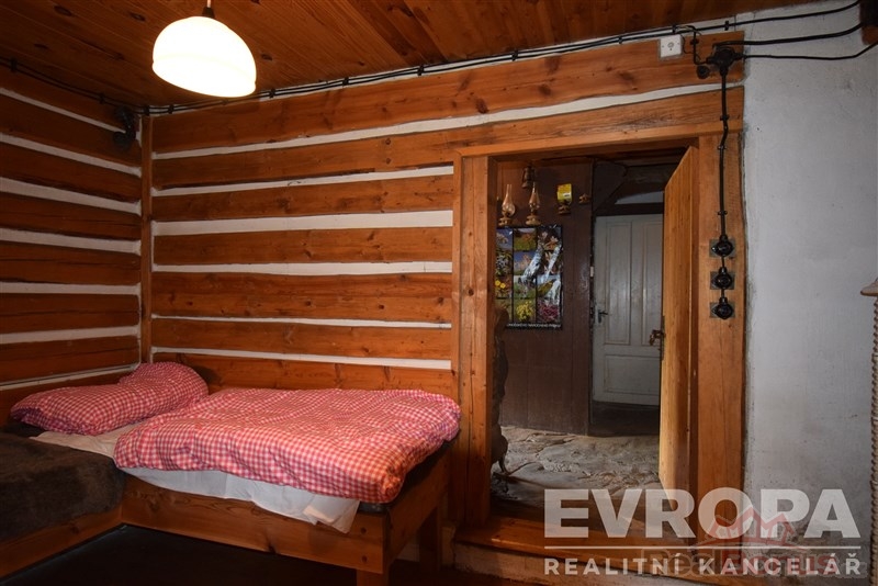 Ve výhradním zastoupení majitele Vám nabízíme roubenou/zděnou chalupu se zastavěnou plochou 150 m2 o dispozici 5+1, postavené na pozemku o výměře 2.585 m2. V přízemí je velká roubená světnice s kachlovými kamny a druhá světnice s kuchyní a koupelnou s WC. V podkrovních částech byly postupně vybudovány tři ložnice ve dvou patrech. Vzhledem k velikosti podkroví je možné vybudování dalšího velkého pokoje nad roubenou částí. Ze stavebního hlediska je statika chalupy bez poškození, dřevěné konstrukce nevykazují napadení škůdci. Opravy a úpravy jsou nutné na elektroinstalaci, komínech a koupelně a celkové modernizaci vzhledem k tomu, že chalupa nebyla posledních deset let užívána.