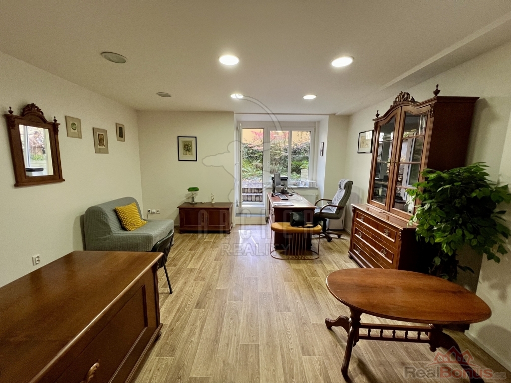 Dispozičně se jedná o příjemný byt 1+1 se samostatným vstupem na nádhernou zahradu se vzrostlými stromy ve vnitrobloku. Při vstupu ze společných prostor se ocitneme v předsíni, která slouží jako komunikační tepna mezi všemi místnostmi bytu a zároveň poskytuje dostatek místa pro úložné prostory. Ve vnitřní části bytu nalezneme samostatnou kuchyňku vybavenou všemi potřebnými spotřebiči a velkou koupelnu se sprchovým koutem a toaletou. Mezi oběma místnostmi je k dispozici šikovná komora. Opravdovou perlou celé jednotky je ovšem rozlehlý pokoj, který slouží jako pracovna o obývací pokoj v jednom. Lze jej pohodlně rozdělit na ložnici, společenskou zónu s jídelním koutem a pracovnu.