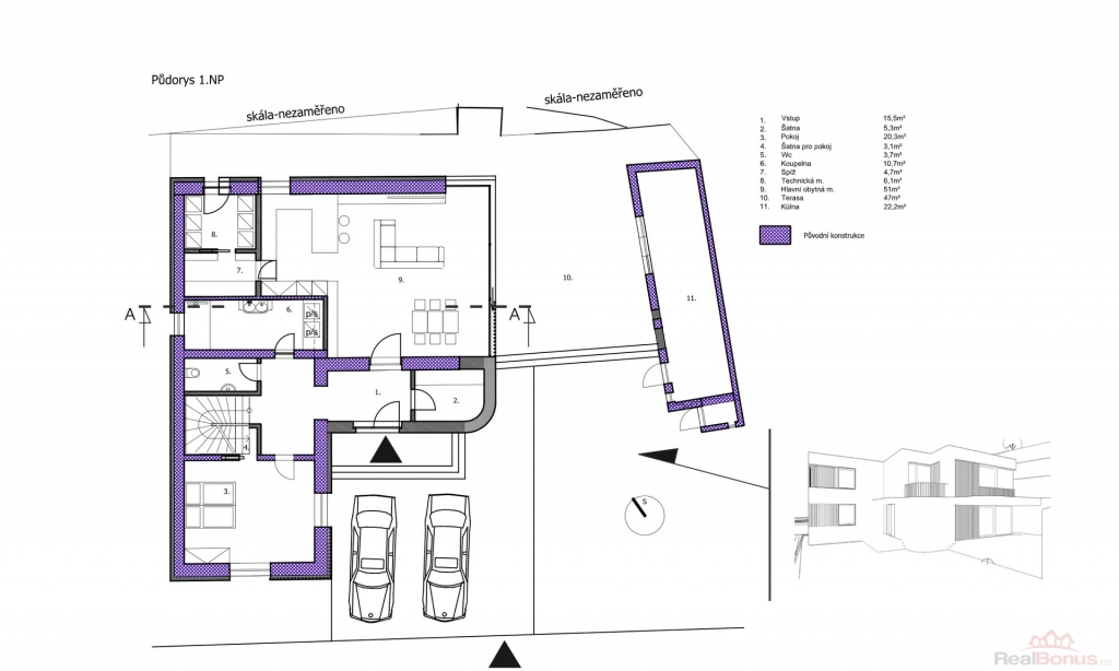 (hlavní stavba zvětšena o koeficient 1,25, včetně nového zateplení)