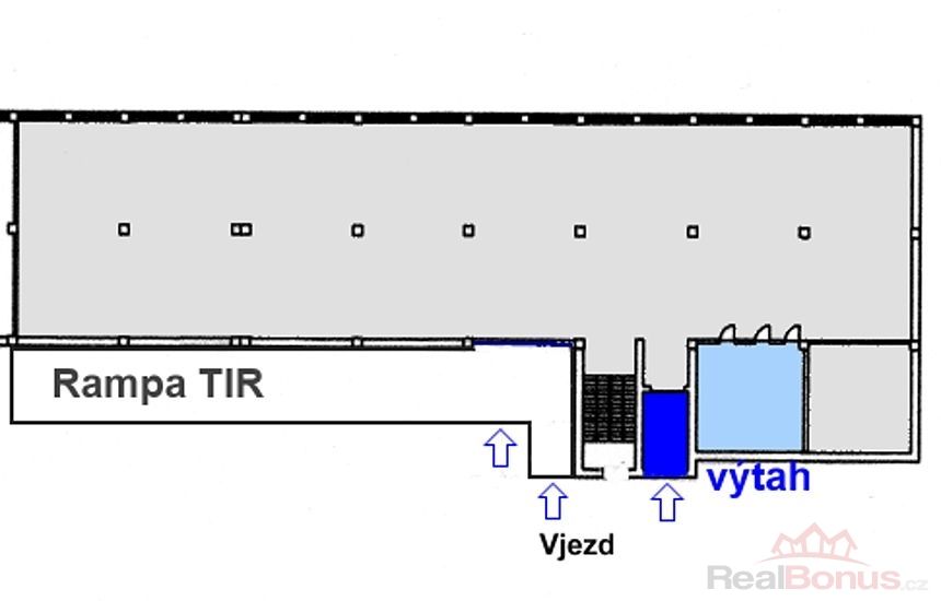 Dále do prostor ústí velký nákladní výtah na Eu Palety. Využitelná výška prostor činí 4 m ( foto¨). Zátěžová betonová podlaha, Okna, denní světlo !