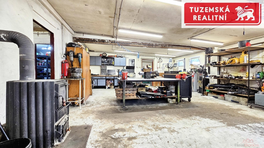 Jistič 80A s novými rozvody elektřiny 380V po celé dílně, 5 kolíkové a 4 kolíkové zásuvky. Výška stropu u vrat 2,25m dále 2,5m, vrata (šířka 2,4m, výška 2m). Topení kamny na tuhá paliva, el. bojler na ohřev teplé vody, pitná voda, vlastní jímka. Stavební materiál cihla, částečně zatepleno (kancelář, šatna, druhá dílna, vrata zatepleny). Po dílně se dá jezdit vysokozdvižným vozíkem Desta MV12B s nosností 1250kg a zdvihem 2,5m. Podlahy jsou betonové, částečně je stěrka, kompresor Orlík s rozvody stlačeného vzduchu.