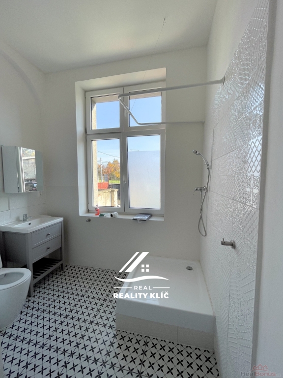 Koupelna zaujme elegantními obklady, sprchovým koutem, moderním umyvadlem s úložným prostorem a toaletou. Ohřev vody zajišťuje bojler.