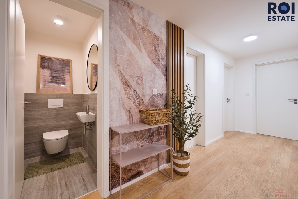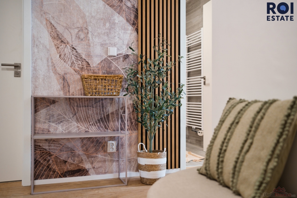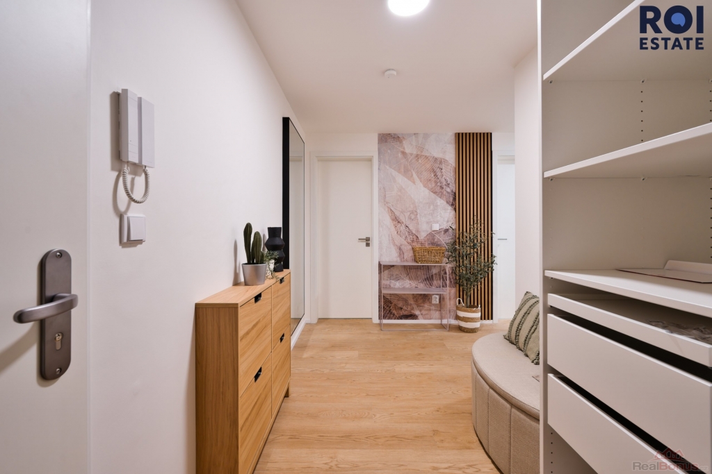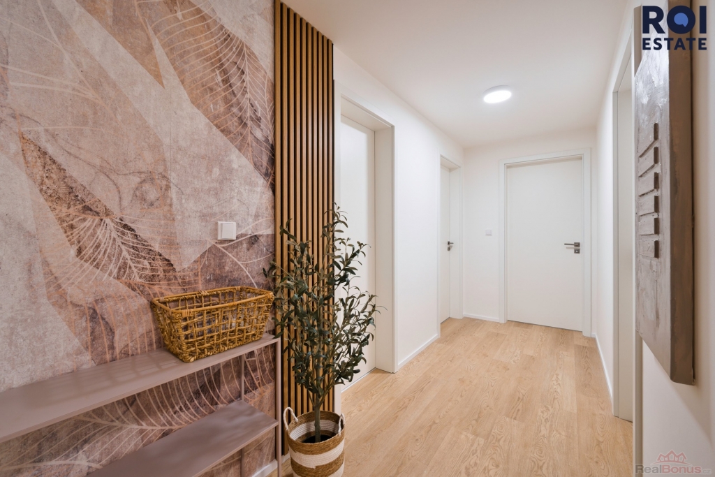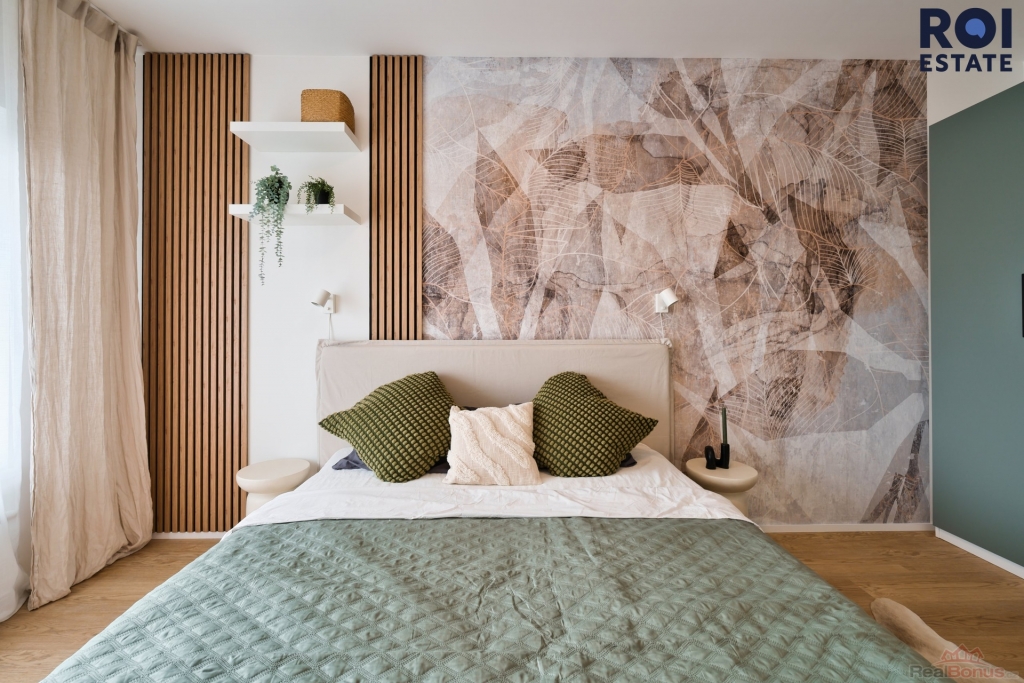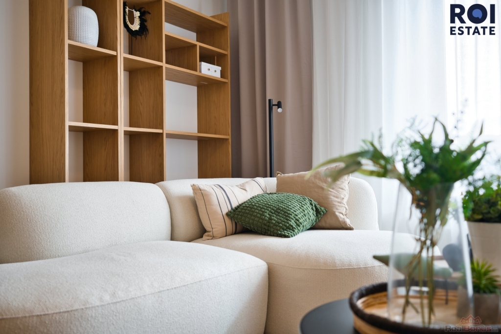 Vybavení bytu: vstupní chodba s úložným prostorem a předsíňovou stěnou, samostatná toaleta, koupelna se sprchovým koutem, pračkou a sušičkou; ložnice s kvalitní postelí, úložnými prostory, šatní skříní a stylovou tapetou; obývací pokoj s moderní kuchyňskou linkou na míru (olivová a cihlová terakota), jídelní kout, světlá sedací souprava, knihovna, stylové osvětlení