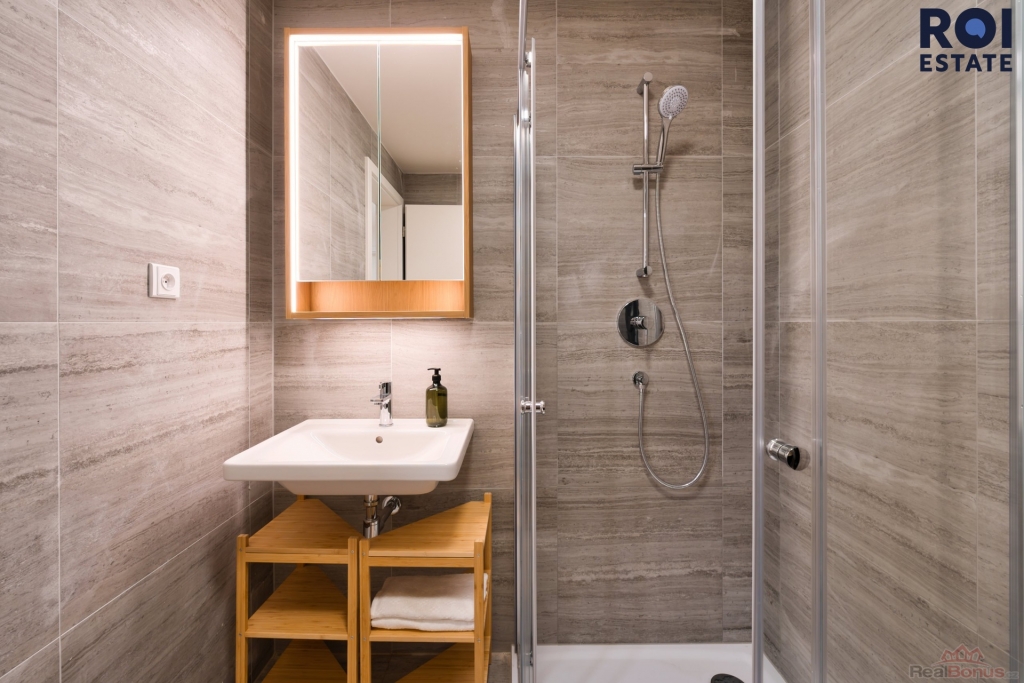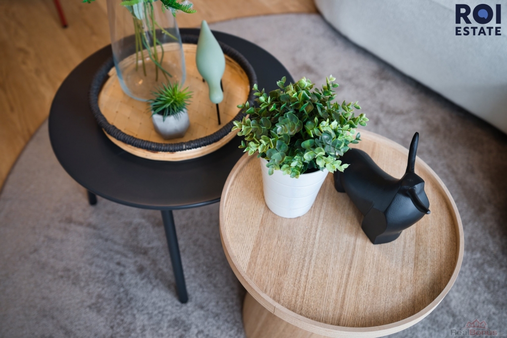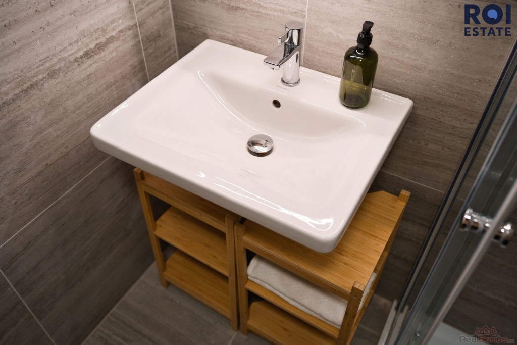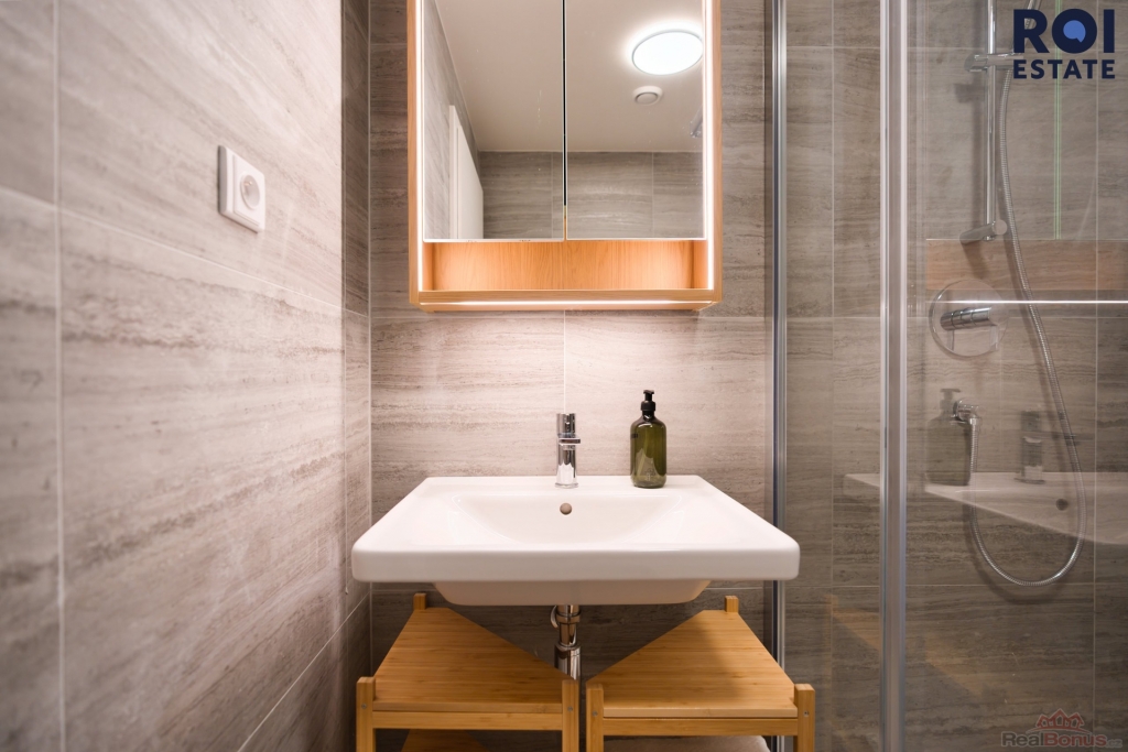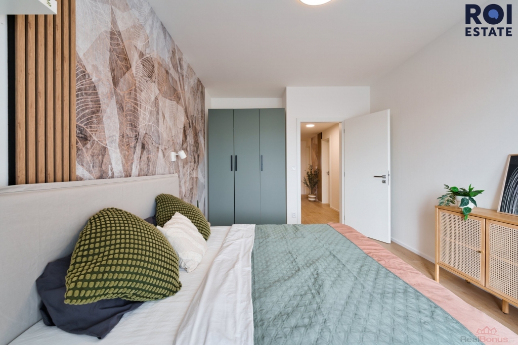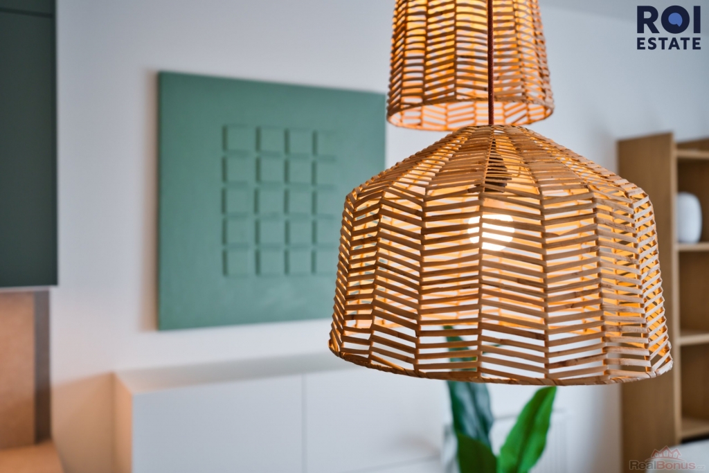 Vybavení bytu: vstupní chodba s úložným prostorem a předsíňovou stěnou, samostatná toaleta, koupelna se sprchovým koutem, pračkou a sušičkou; ložnice s kvalitní postelí, úložnými prostory, šatní skříní a stylovou tapetou; obývací pokoj s moderní kuchyňskou linkou na míru (olivová a cihlová terakota), jídelní kout, světlá sedací souprava, knihovna, stylové osvětlení