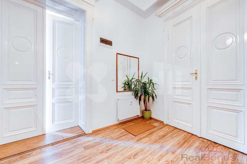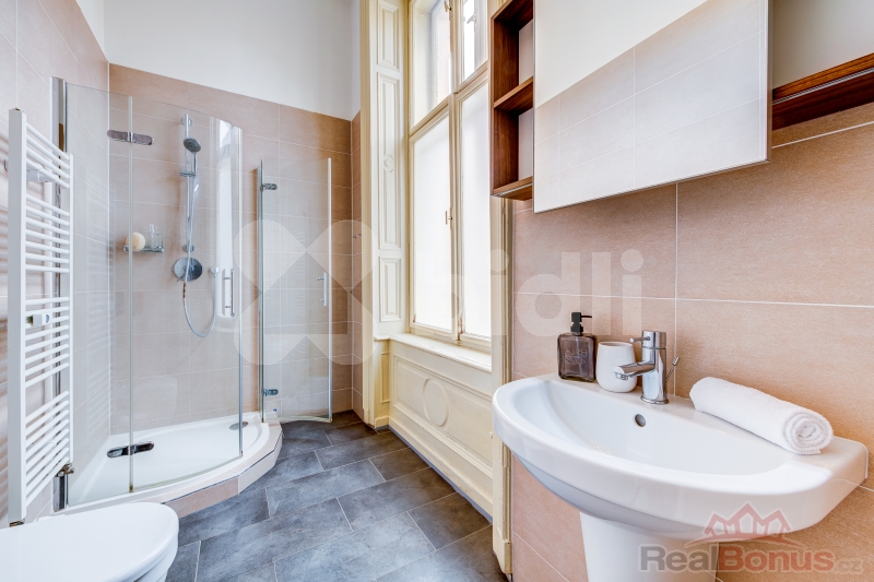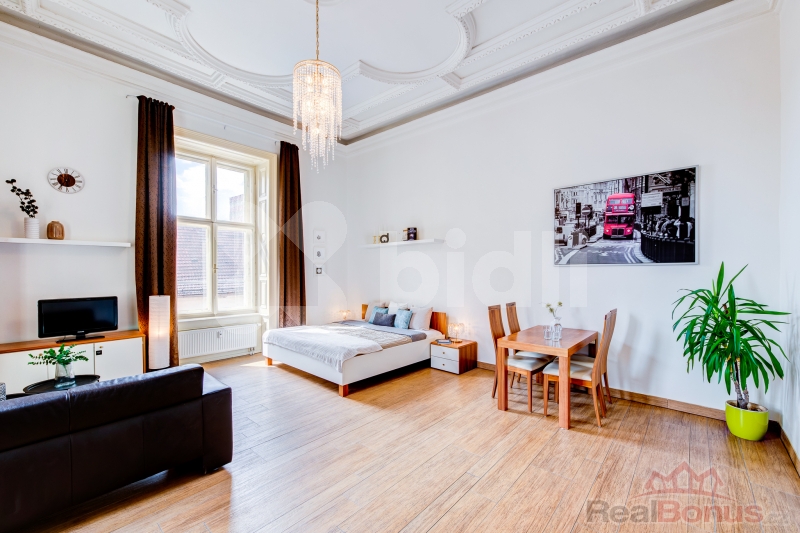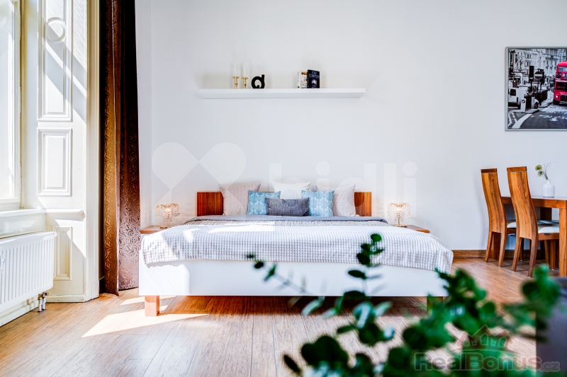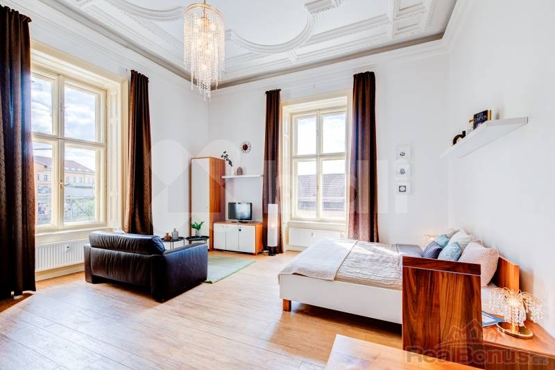 Nabízíme vám zařízený moderní byt v revitalizovaném secesním domě o dispozici 1+1 o celkové ploše 52 m2. Byt se nachází ve 2. nadzemním podlaží, kde je k dispozici výtah. Součástí pronájmu bytu je veškeré vybavení, jako je myčka, pračka, lednice, sklokeramická varná deska, el. trouba s grilem, mikrovlnná trouba, kuchyňský inventář, televize, pracovní stůl s židlí, postel, skříně, jídelní stůl, židle, sedačka. V koupelně je sprchový kout a závěsná toaleta. Byt je orientovaný na jih a východ.