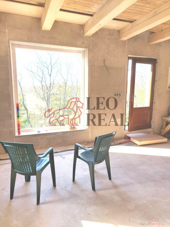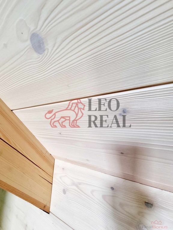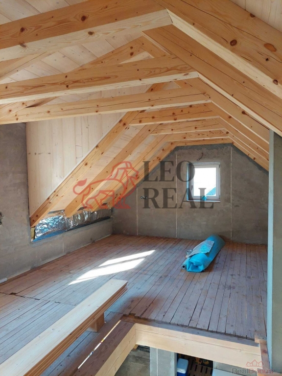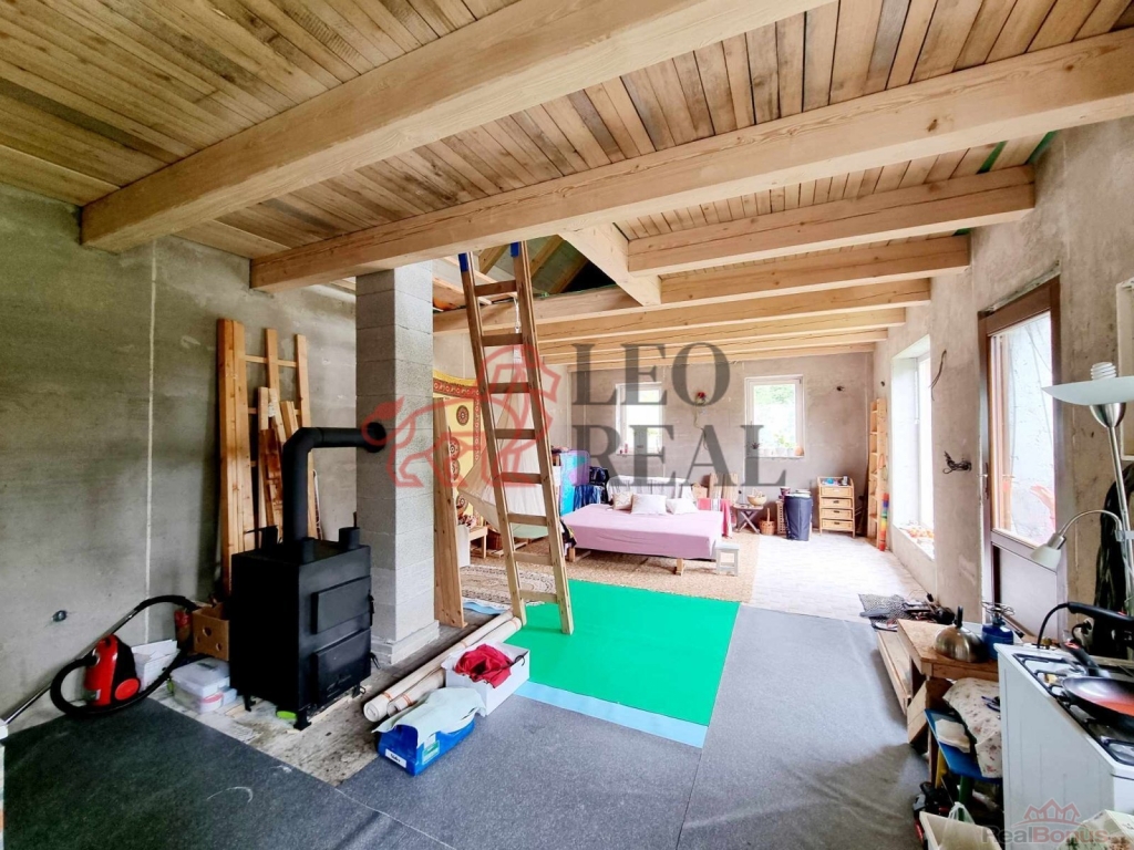 Stavba je postavena z porothermu, má dřevěné pohledové stropní trámy, dřevěnou pohledovou konstrukci stropu v podkroví z drásaných fošen, izolaci střechy 30cm minerální vlny a střešní krytinu bramac (bobrovka) s okapy, příčku oddělující technickou místnost, komín, dřevěná okna a vstupní dveře. V domě jsou rozvody vody, elektřiny a odpadu, vodovodní a elektropřípojka jsou součástí pozemku. V obci není vybudována kanalizace, v PD je plánován septik. Plánováno je topení dřevem (tuhá paliva) s akumulační pecí, případně lze upravit pro krbová kamna, nebo změnou PD na jiný druh vytápění. Teplá voda je plánována instalací el.bojleru, a společně s WC, pračkou, umyvadlem se sprchovou hadicí budou součástí technické místnosti. Sprchový kout je zděný a je řešen samostatným koutem spolu s umyvadlem jako součást hlavní místnosti. V plánu je velký kuchyňský kout ve tvaru L. Podkroví je v PD plánováno pro využití jako velké úložné prostory.