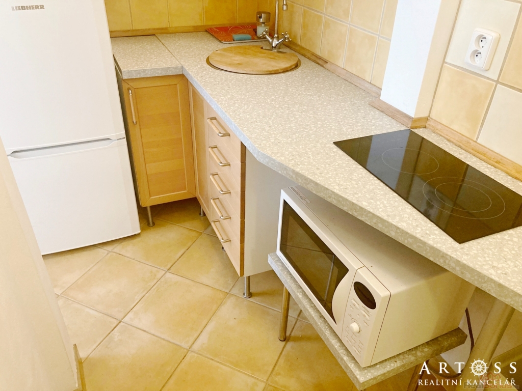 Kuchyně je vybavena varnou deskou, lednicí, mikrovlnkou i kompletním nádobím pro provoz bytu.