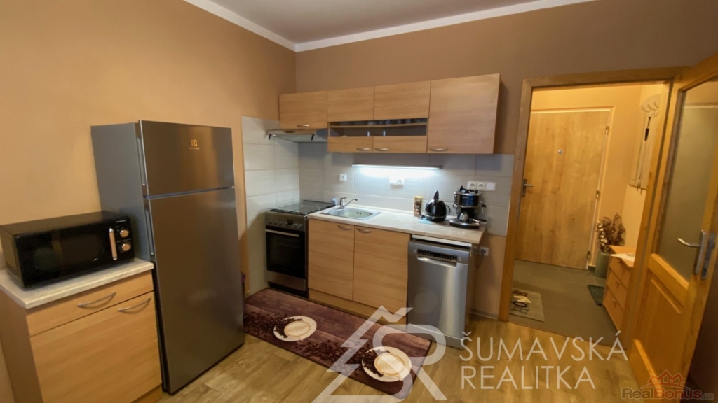 Dispozice bytu: vstupní předsíň, místnost s obývací částí se sedací rozkládací soupravou a jídelní částí s plně vybavenou kuchyní se spotřebiči mikrovlnná trouba, sporák, myčka). Ložnice s dvoulůžkem, skříní, komodou s TV. Koupelna (se sprchovým koutem, umyvadlem a toaletou). Na podlaze je linoleum s dekorem dřeva. Nájemné/měsíc 10.000,-Kč + 3.000,-Kč( služby) + 800,-Kč (elektřina)+ plyn 200,-Kč. Celkem 14.000,-Kč. Vratná kauce 20.000,-Kč. Provize RK 10.000,-Kč
