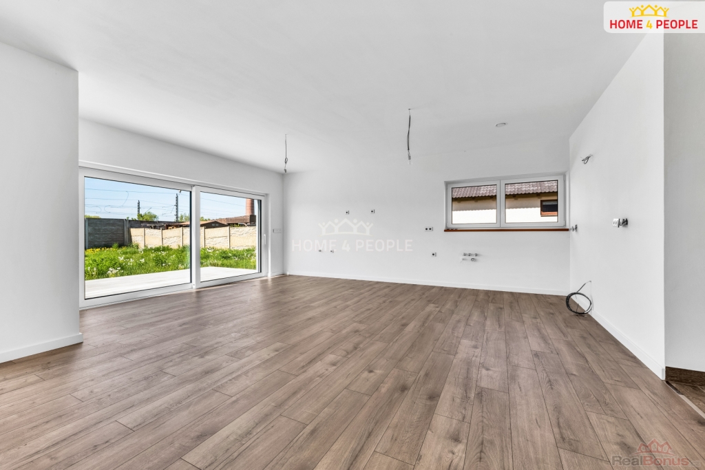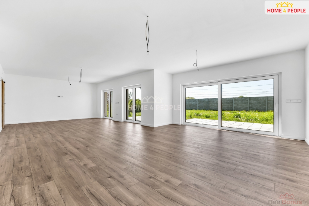 Přízemí tvoří vstupní hala (21,39m), spíž na uskladnění potravin (2,31m), technická místnost(3,26m), dva pokoje (10,26 m a 14,89m), dvě koupelny se sprchovým koutem a WC(5,78m a 4,55m) ,prostorný obývací pokoj s kuchyní(55,13m) ze kterého je vchod na velkou slunnou terasu a zahradu.