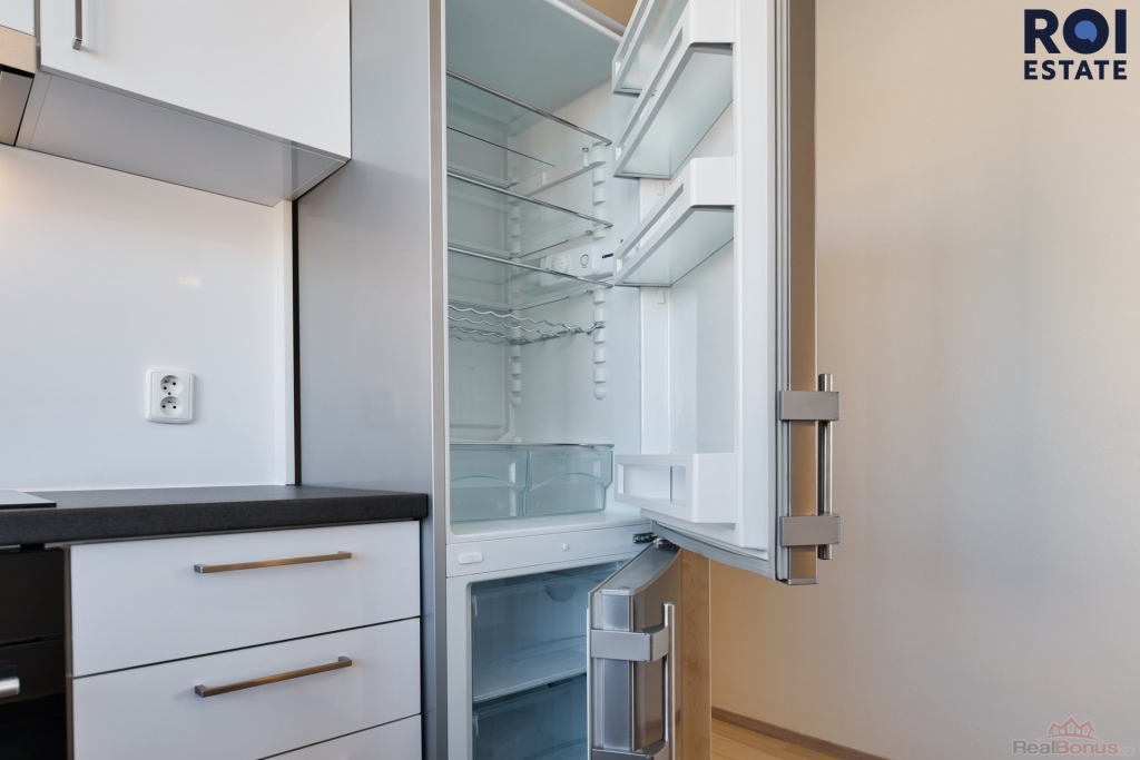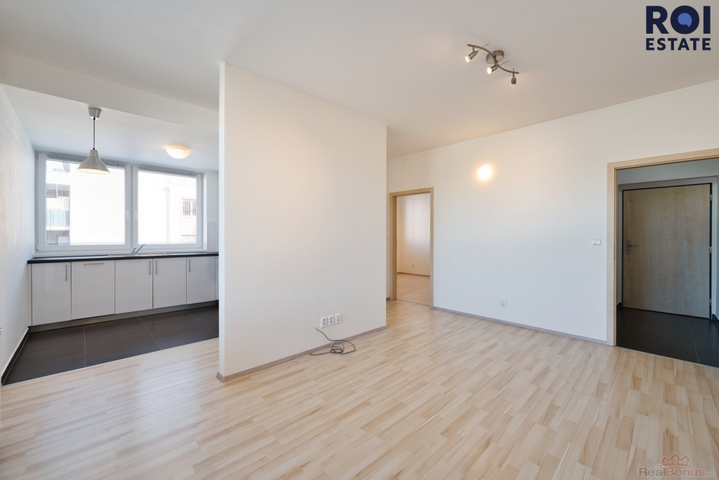 Byt o velikosti 49 m2 s balkonem 4 m2 působí velmi světlým a čistým dojmem. Obývací pokoj je propojený s moderní kuchyní ve vysokém lesku, která je vybavena vestavěnými spotřebiči včetně myčky, varné desky, trouby a lednice s mrazákem. Z obývací části je vstup na balkon s příjemným výhledem do okolí.