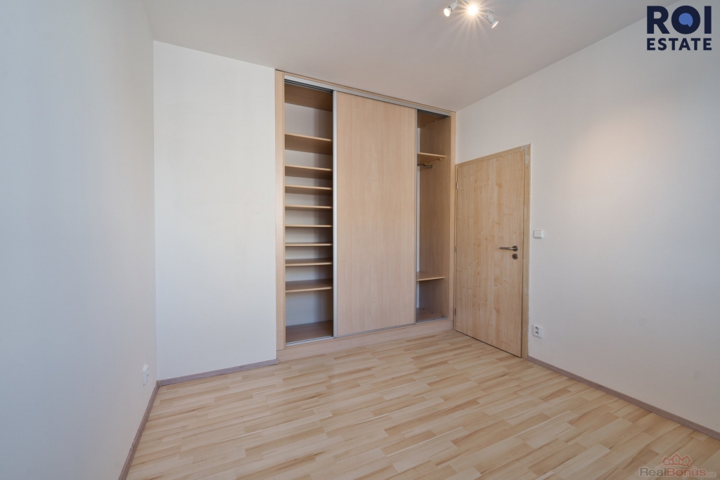 Ložnice je samostatná a nabízí velkou vestavěnou skříň s dostatkem úložného prostoru. Koupelna je řešena v moderním stylu v odstínech šedé a černé, se sprchovým koutem a praktickou umyvadlovou skříňkou. Toaleta je oddělená.