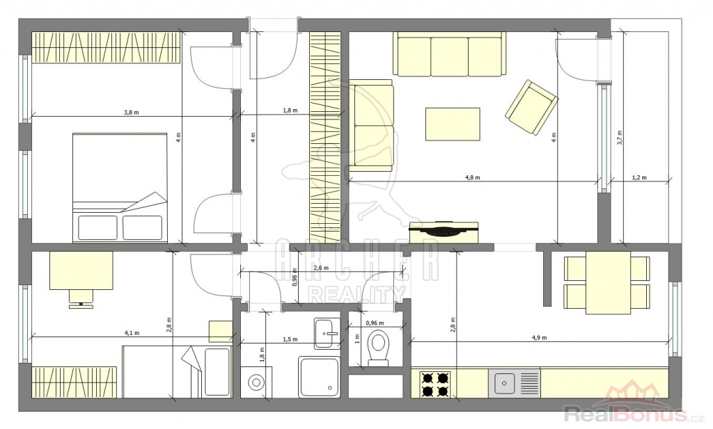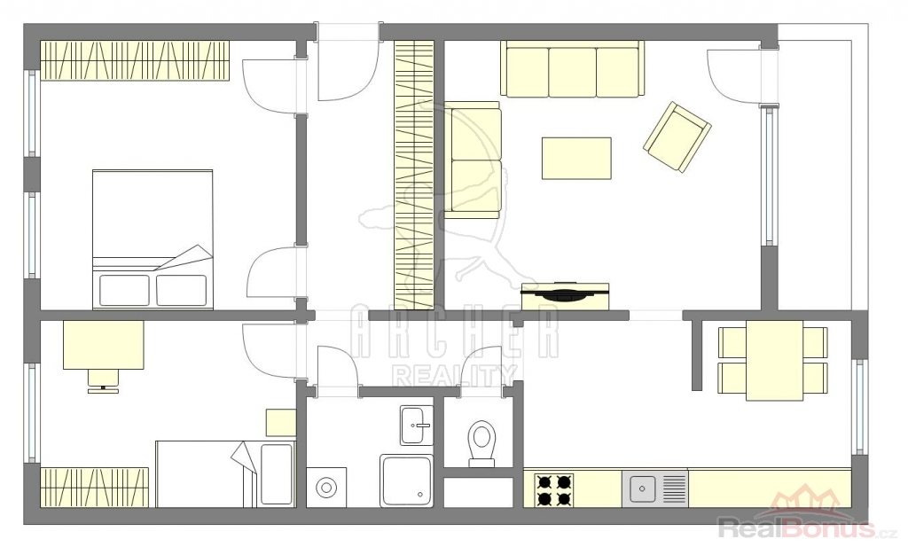 Kuchyně potěší svou velikostí i možností umístit velký jídelní stůl pro společné rodinné chvíle. Z kuchyně se vstupuje do velkého obývacího pokoje, orientovaného na jižní stranu, díky čemuž je krásně prosvětlený po celý den. Z obývacího pokoje je navíc přístup na lodžii. Byt dále disponuje dvěma dalšími pokoji.