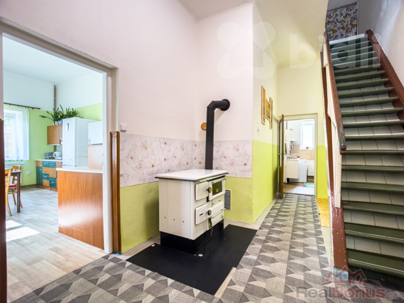 V předsíni jsou navíc funkční kamna na tuhá paliva, na kterých se dá i vařit. Nově litý beton, v obývacím pokoji a dětském pokoji nové lino.