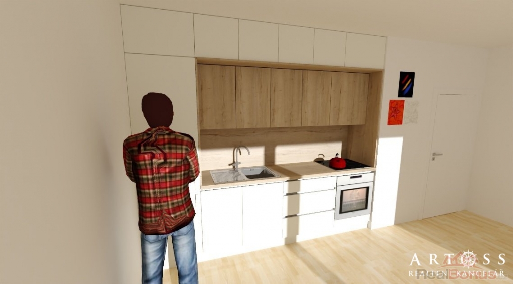 V bytě bude kuchyňská linka vyrobena na míru od stolařství FAIN Interier, vč. vestavěných spotřebičů a to elektrické trouby, indukční desky, digestoře, myčky a chladničky s mrazákem.