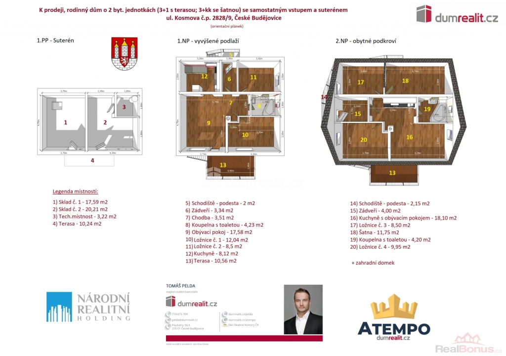Cena je včetně provize RK a právního servisu. Více informací Vám poskytne makléř Tomáš Pelda, Dumrealit.cz Vám zprostředkuje prodej dokončeného rodinného domu o 2 bytových jednotkách (3+1 s terasou; 3+kk se šatnou a možností propojení v jeden rodinný dům) se samostatnými vchody, parkovacími místy před domem, společnou oplocenou zahradou a skladovacími prostory v suterénu domu s možnosti přestavby na 3 bytovou jednotku s bezbariérovým přístupem v klidné části městské čtvrti Suché Vrbné ve městě České Budějovice, ul. Kosmova 2828/9. Zděný RD byl zkolaudován v roce 2017 a do dnešního dne je pronajat dlouhodobým nájemníkům (nájemné celkem 26.000,-Kč + energie/měsíc). Vytápění je řešeno elektrickými přímotopy, v bytě v 1.NP je možné topit kamny na tuhá paliva. Ohřev teplé vody je za pomoci elektrického bojleru. Objekt je připojen na elektrickou síť, veřejný vodovod a městskou kanalizaci. Bytové jednotky mají podružné měření energií (el., voda). Doporučuji prohlídku, nemovitost je vhodná k investici nebo ke klidnému rodinnému bydlení. Více informací Vám poskytne realitní makléř Tomáš Pelda z realitní kanceláře A TEMPO fungující pod ochrannou známkou dumrealit.cz. Zajistíme Vám financování a veškerý právní servis. Ev. číslo: 652429. Energetický štítek: B (173 kWh/m2/rok).
