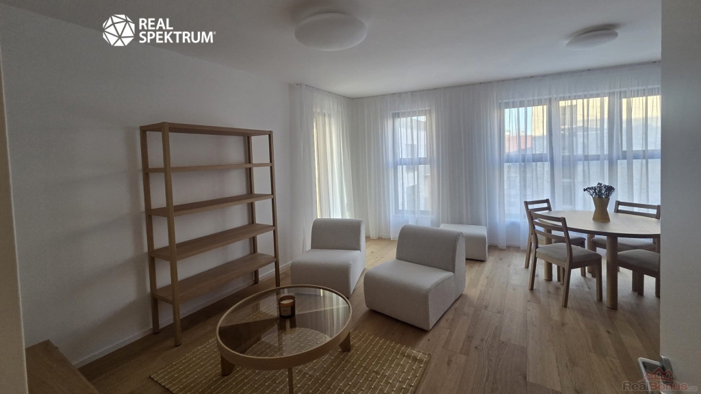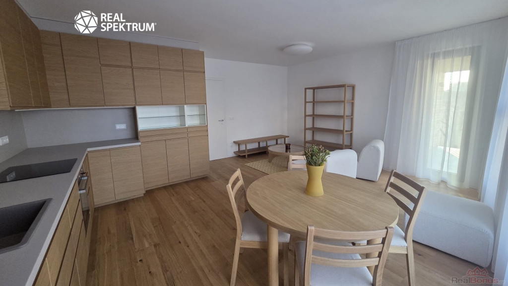 Interiér je vybaven kuchyňskou linkou se spotřebiči a kompletním nábytkem. Úložné prostory jsou řešeny chytře, interiér je vzdušný, čistý, nadčasový a designově velmi povedený. Celková atmosféra bytu je příjemná ? působí jako moderní a útulné místo, kde se člověk okamžitě cítí dobře.