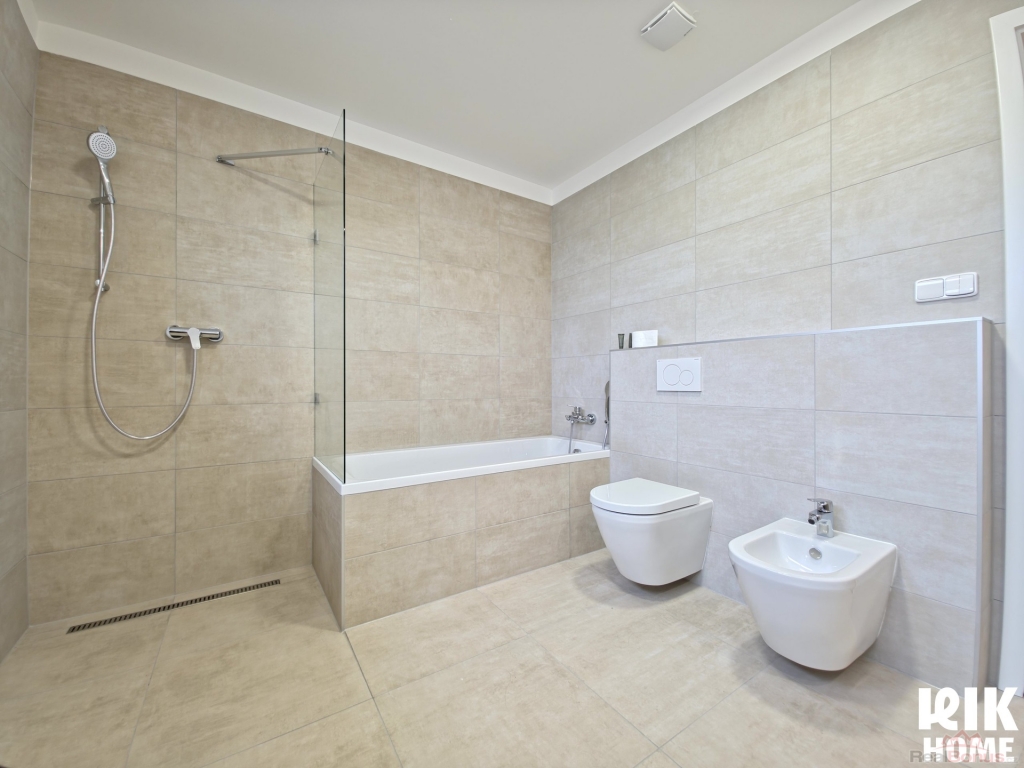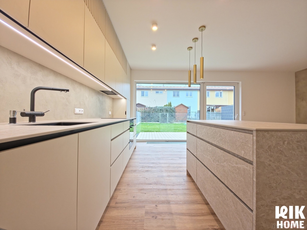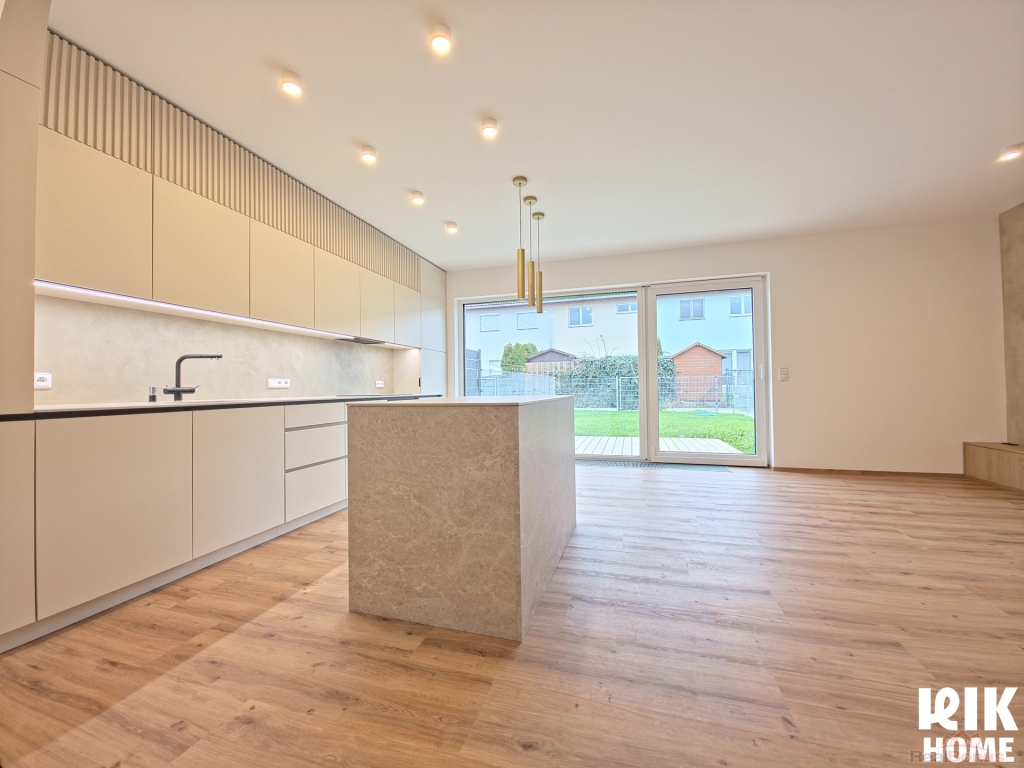 Kuchyň je propojena s obývacím pokojem a celý prostor je řešen ve vysokém standardu s důrazem na kvalitu provedení a funkčnost. Naproti kuchyňské lince je připravena přípojka pro TV, podél stěn jsou vestavěné skříně. Z obývacího pokoje je přímý vstup na zahradu o velikosti 76 m2, která poskytuje dostatek prostoru pro odpočinek i rodinné posezení.