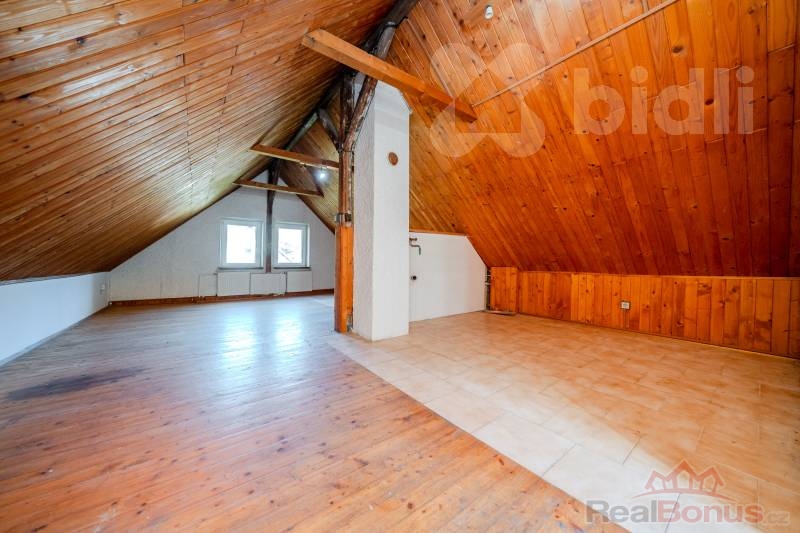 V patře se nachází velmi prostorná a praktická půda, kde je již vyvedený centrální ohřev včetně radiátorů. Prostor lze upravit na jeden velký dětský pokoj nebo dva standardní pokoje.