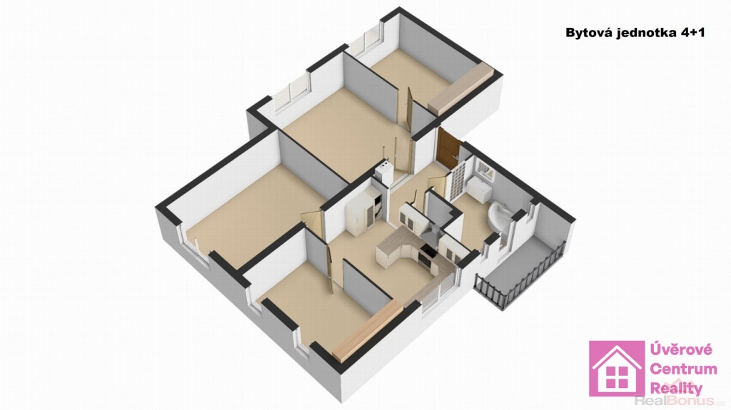Dispozice: předsíň, koupelna (rohová vana), balkón, toaleta, kuchyně a 4 pokoje. Půdorys bytu naleznete ve fotogalerii.