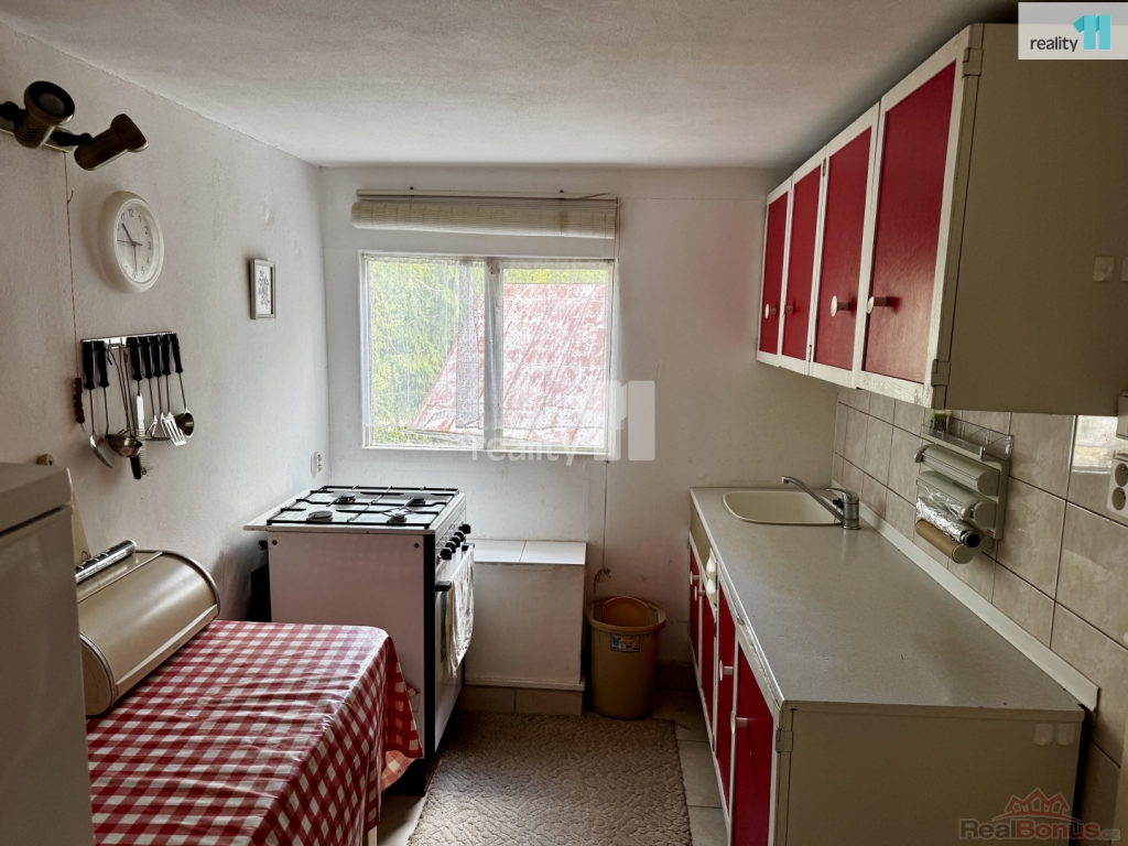 Přízemí: veranda s komorou, hlavní obytná místnost s krbovými kamny a nádherným výhledem na přehradu, kuchyně se sporákem na PB, linkou, lednicí a stolem. Z kuchyně se vchází do koupelny se sprchovým koutem, umyvadlem a WC.