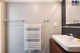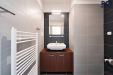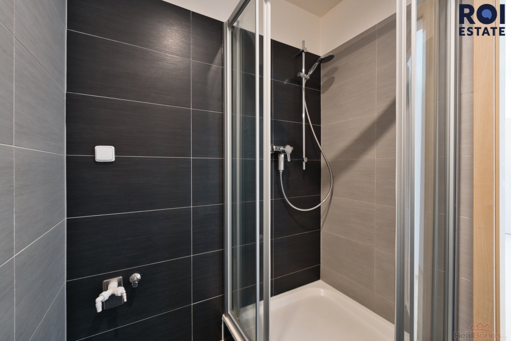 Ložnice je samostatná a nabízí velkou vestavěnou skříň s dostatkem úložného prostoru. Koupelna je řešena v moderním stylu v odstínech šedé a černé, se sprchovým koutem a praktickou umyvadlovou skříňkou. Toaleta je oddělená.