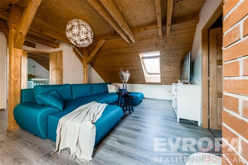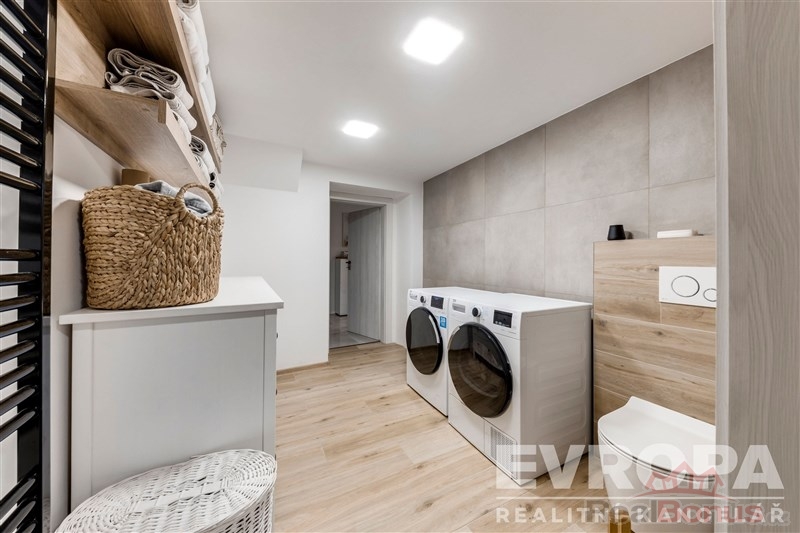 Interiér je dokonalým propojením dřeva, doplněné o designovou dlažbu, luxusní spotřebiče a hlavně je zde na každém kroku cítit otisk vkusného a praktického využití každého koutu.