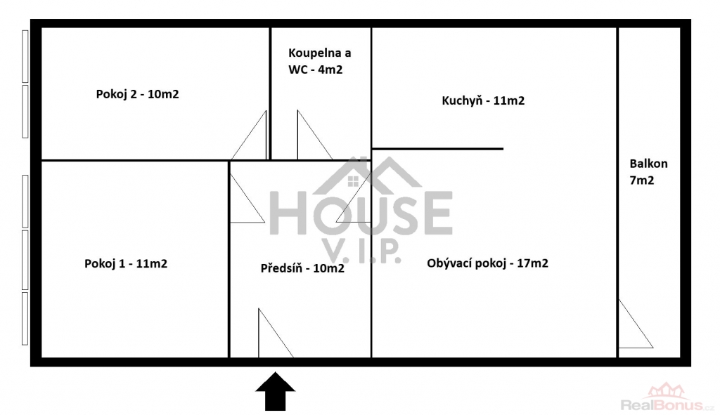 Byt tvoří prostorný obývací pokoj s kuchyňským koutem, dvě ložnice (orientované na západ), koupelna se sprchovým koutem a samostatná toaleta.