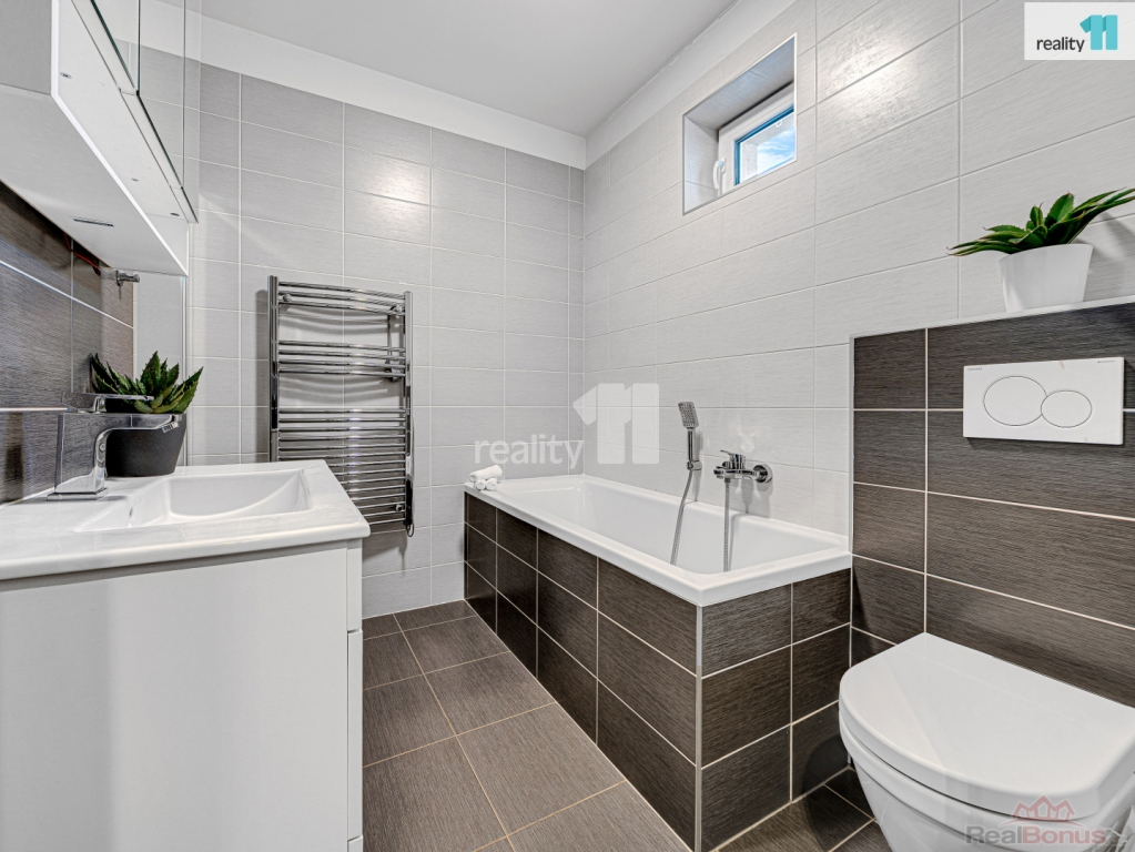 Interiér tvoří vstupní hala s praktickým úložným prostorem a vestavěnou skříní, prostorný obývací pokoj s přímým vývodem pro krbová kamna a moderní kuchyní s vestavnými spotřebiči. V ložnici se nachází velká vestavěná šatní skříň, která nabízí dostatek místa pro všechny vaše věci. Dále jsou zde dva samostatné pokoje, koupelna s vanou i sprchovým koutem, dvě toalety a technická místnost.
