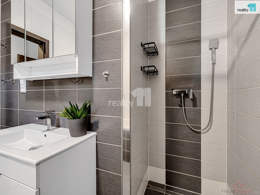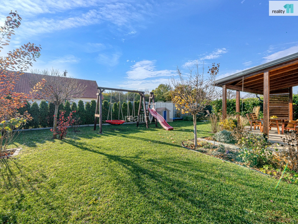 Součástí prodeje je upravená zahrada s krytým posezením pod pergolou, zahradní domek i elektricky ovládaná vjezdová brána. V podkroví je navíc úložný prostor o velikosti přibližně 8 m, ideální pro sezónní věci.