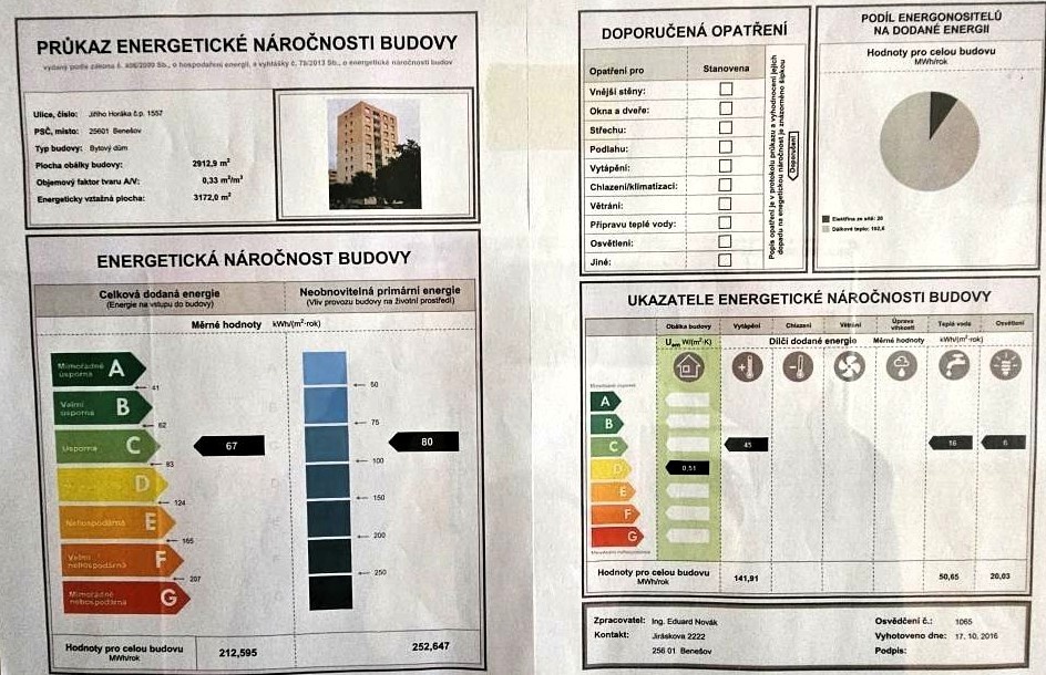 Byt se nachází v 6. patře panelového domu, který je zateplený a je vybaven dvěma výtahy ? osobním a druhým, určeným pro přepravu materiálu, což je praktické především při rekonstrukci. Okna jsou plastová, vytápění i ohřev teplé vody jsou dálkově.