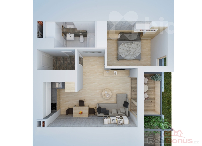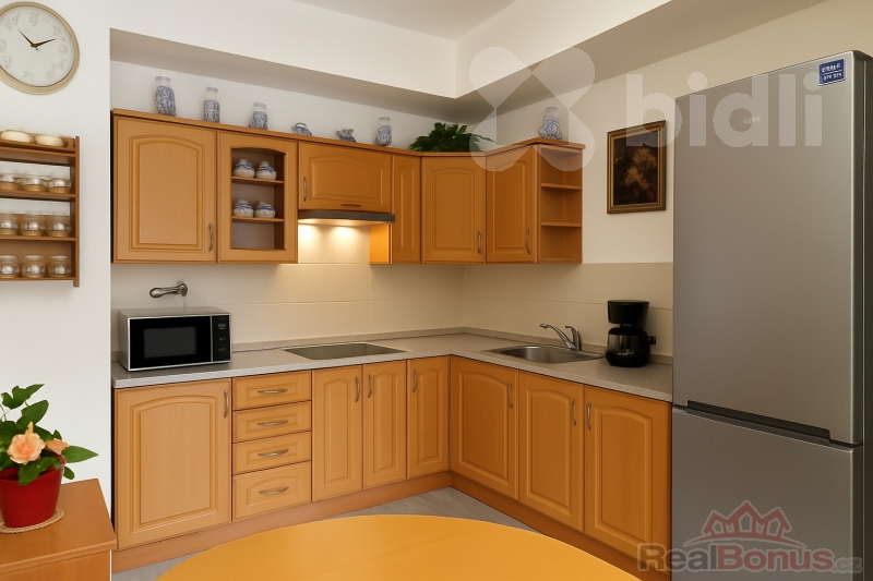 Dispozici tvoří prostorný obývací pokoj s kuchyňským koutem, ze kterého je přímý vstup na slunnou terasu se zahrádkou, dále ložnice a koupelna se sprchovým koutem a toaletou. Byt je prostorný, světlý a s výbornou energetickou náročností třídy B a nízkými provozními náklady.