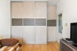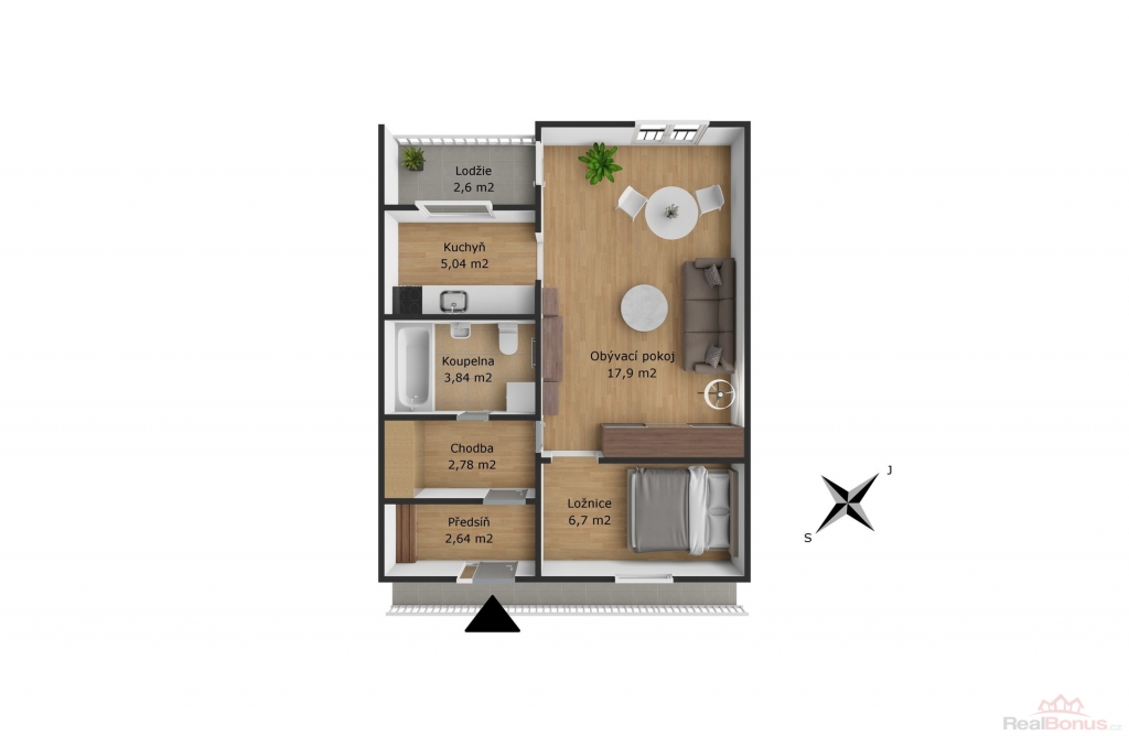 Obývací pokoj je chytře rozdělen vysokou skříní, která vytváří oddělený prostor pro spaní. Vzniká tak malá ložnice s postelí, která nabízí soukromí, aniž by omezovala obytnou část. Z obývacího pokoje je přímý vstup na balkon o velikosti 2,6 m2. Samostatná kuchyně umožňuje pohodlné fungování domácnosti, bez toho, aby zasahovala do obytné části.