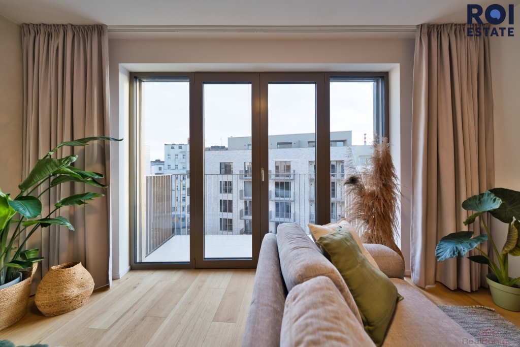 Obývací část s přirozeným světlem, velká francouzská okna zaplavují prostor denním světlem a vedou na příjemný balkon orientovaný do vnitrobloku, kde si můžete vychutnat ranní slunce i večerní klid.