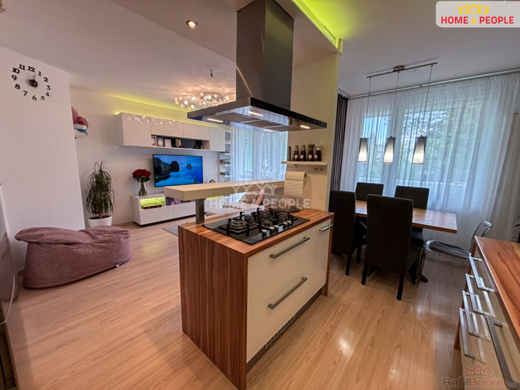 moderní kuchyňskou linkou s ostrůvkem, plynovou sklokeramickou deskou a všemi