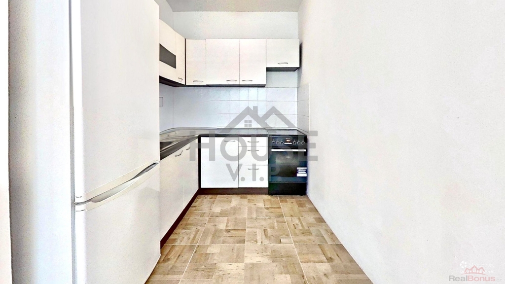 Kuchyňská linka je vybavena lednicí, varnou deskou a troubou.