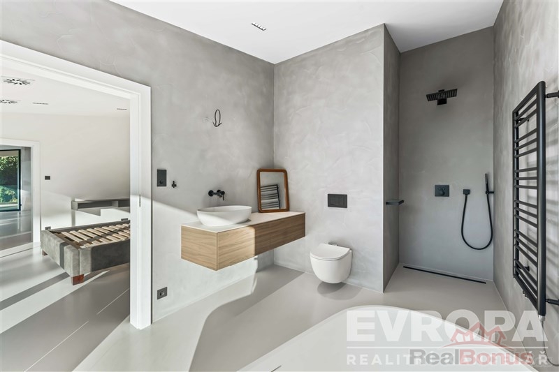 Koupelny splňují nejvyšší standardy, byl zde kladen důraz na praktičnost s vysokou dávkou elegance. Designová sanita, umyvadla na desku, solitérní vana, polyureová stěrka, dřevěný nábytek.
