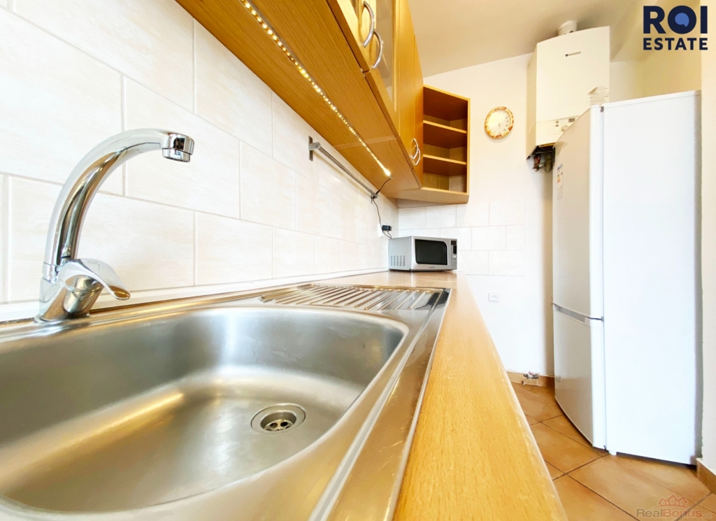 Disponuje hlavní obytnou místností vybavenou pohodlným gaučem. S kuchyní je tento obývací prostor propojen velmi šikovně tak, že při vaření nebudete zavření v samostatné místnosti, ale zároveň je tato část lehce oddělena. Kuchyňská linka je vybavena všemi spotřebiči ? sporákem s troubou, myčkou nádobí i velkou lednicí. Při uskladnění potravin oceníte zabudovanou spíž. Z kuchyně je vstup na prostornější ze dvou balkonů, kterými je tento byt vybaven. Bonusem, který oceníte zejména v nadcházejících letních měsících je vybavení bytu klimatizací, která je osazena v obývací části, s výměníkem umístěným na balkoně.