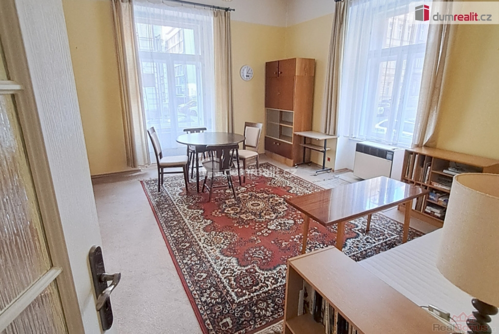 Byt se nachází ve zvýšeném přízemí. Dispozičně 3+kk (2+1), hala, koupelna a WC. Pokoj s kuchyňským koutem má téměř 26 m, druhý pokoj 27 m a ložnice 16 m, dále hala 11 m, koupelna se sprchovým koutem 2,7 m a toaleta s místem pro umístění pračky 2 m. Hala s koupelnou a toaletou byla nově rekonstruována, pokoje jsou udržovány. Kuchyňský kout je možné přemístit do většího pokoje a ponechat tak další samostatnou ložnici se dvěma okny směřujícími do boční ulice. Výhodou jsou i vysoké stropy pro možnou instalaci pater na spaní. Podlahy tvoří dlažba, lino a celkem zachovalé parkety, ohřev teplé vody el. bojlerem, vytápění 2x nové WAW, 1x akumulační kamna, topný žebřík. Možno instalovat 3. WAW nebo rozvod ÚT s plynovým kotlem.
